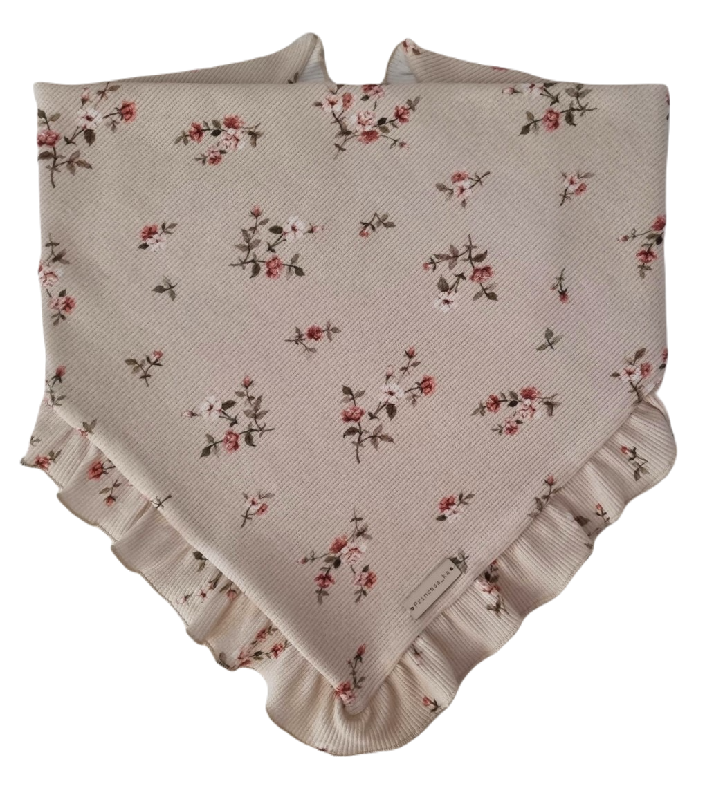 Piękna chusta z falbanką, która wykończona jest ozdobnym ściegiem z pewnością podkreśli każdą dziewczęcą stylizację.