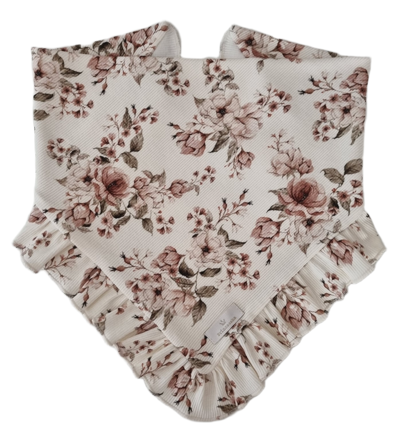 Piękna chusta z falbanką, która wykończona jest ozdobnym ściegiem z pewnością podkreśli każdą dziewczęcą stylizację.