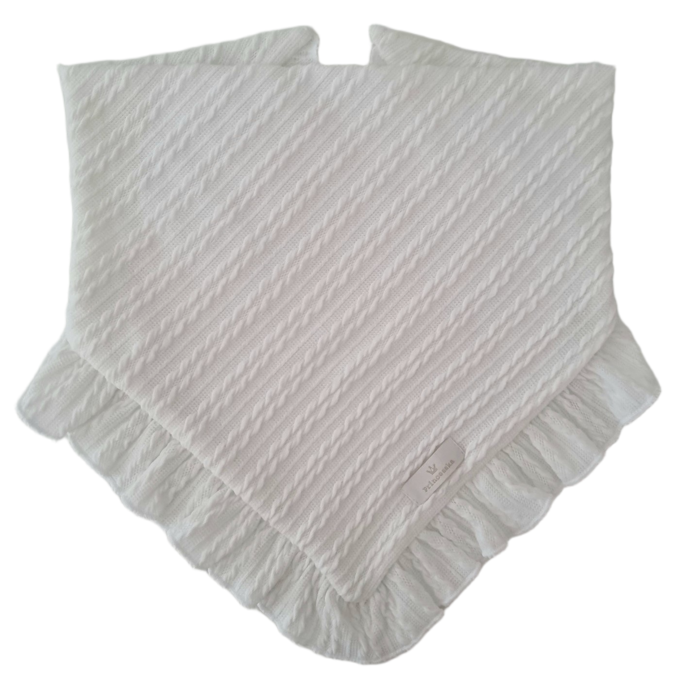 Piękna chusta z falbanką, która wykończona jest ozdobnym ściegiem z pewnością podkreśli każdą dziewczęcą stylizację.