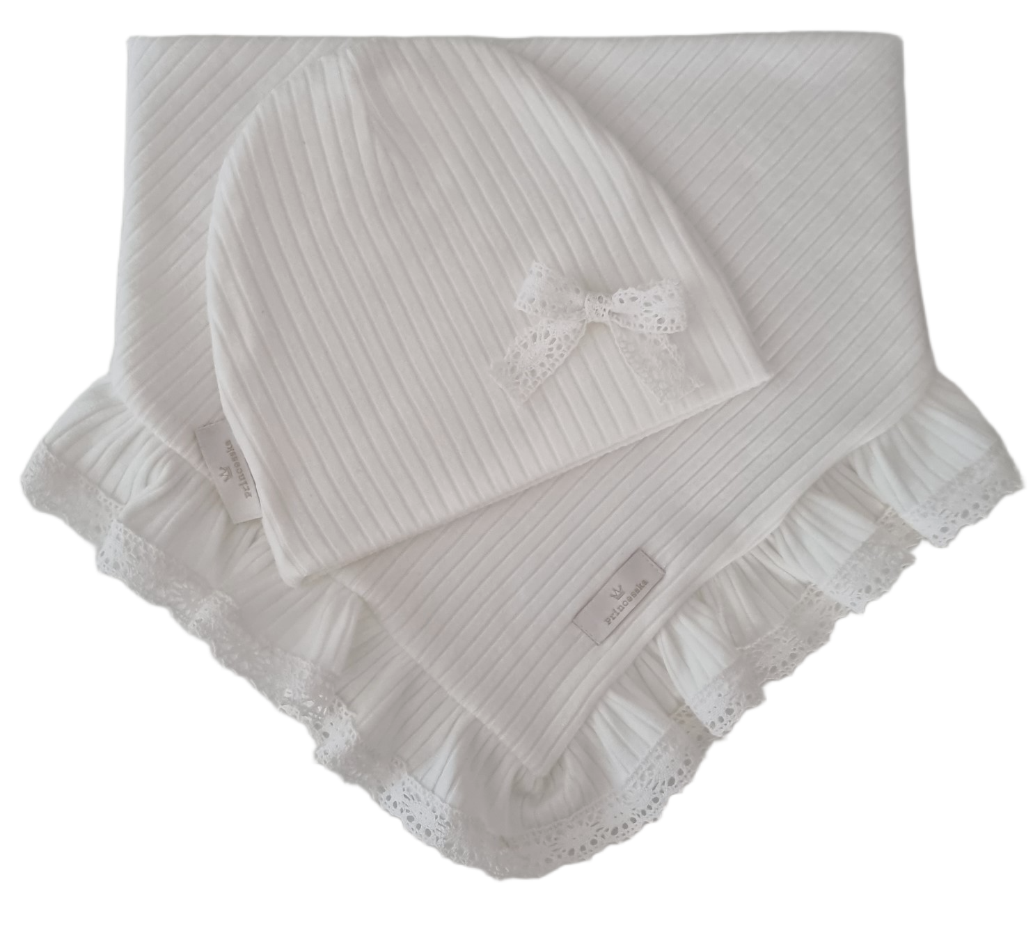 Piękny komplet czapka z koronkową kokardką i chusta z falbanką, która również wykończona jest koronką.