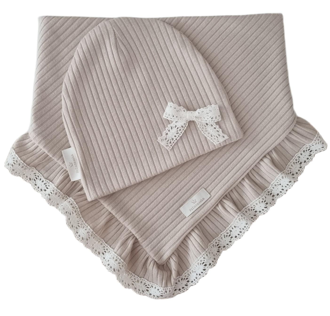 DZIEWCZĘCY KOMPLET CZAPKA Z KOKARDKĄ I CHUSTA Z KORONKOWĄ FALBANKĄ sweterek prążek Jasny Beż
