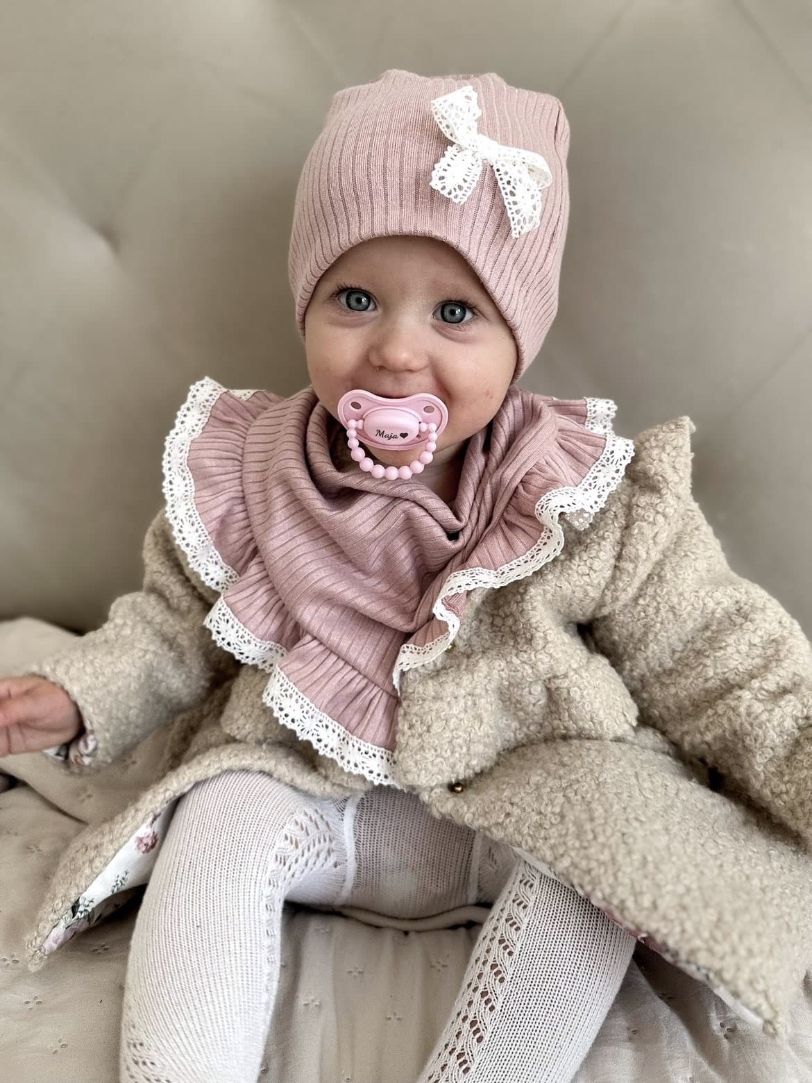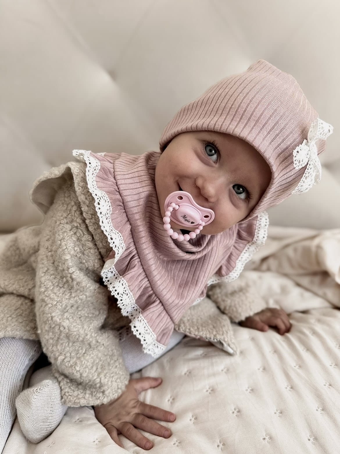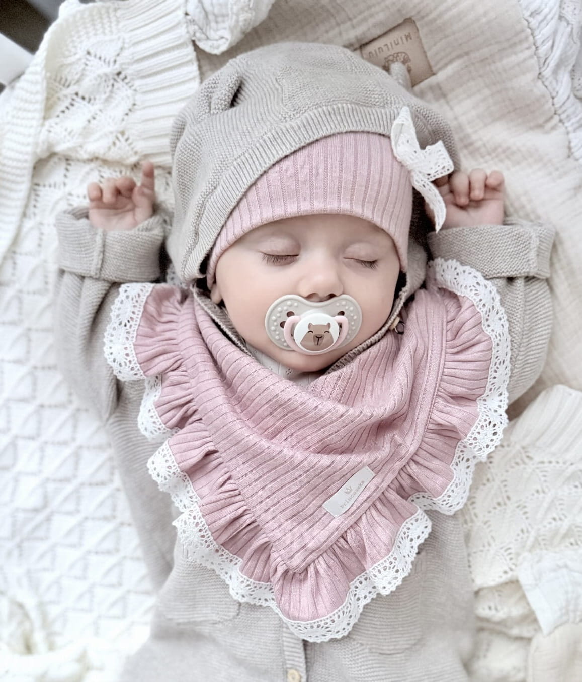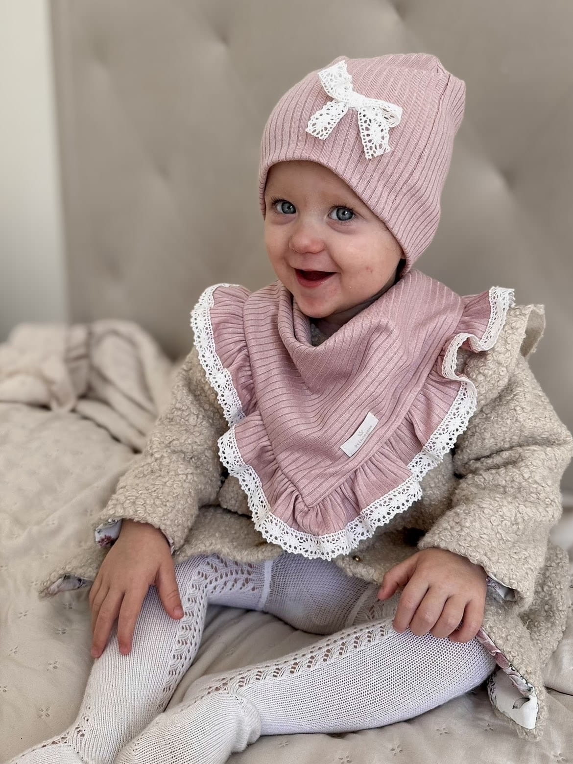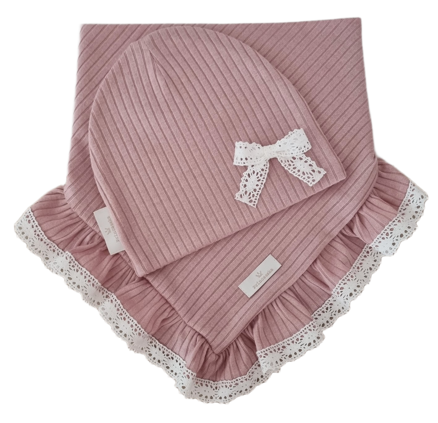 DZIEWCZĘCY KOMPLET CZAPKA Z KOKARDKĄ I CHUSTA Z KORONKOWĄ FALBANKĄ sweterek prążek Pudrowy Róż