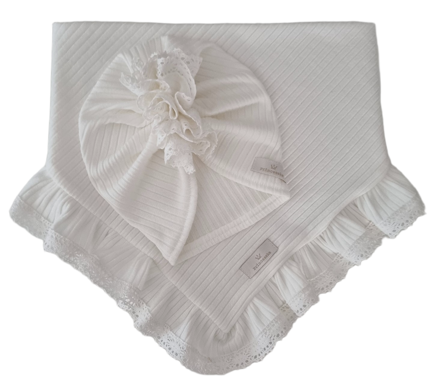 Piękny komplet turban z falbanką oraz chusta z falbanką obszyte delikatną szydełkową koronką.