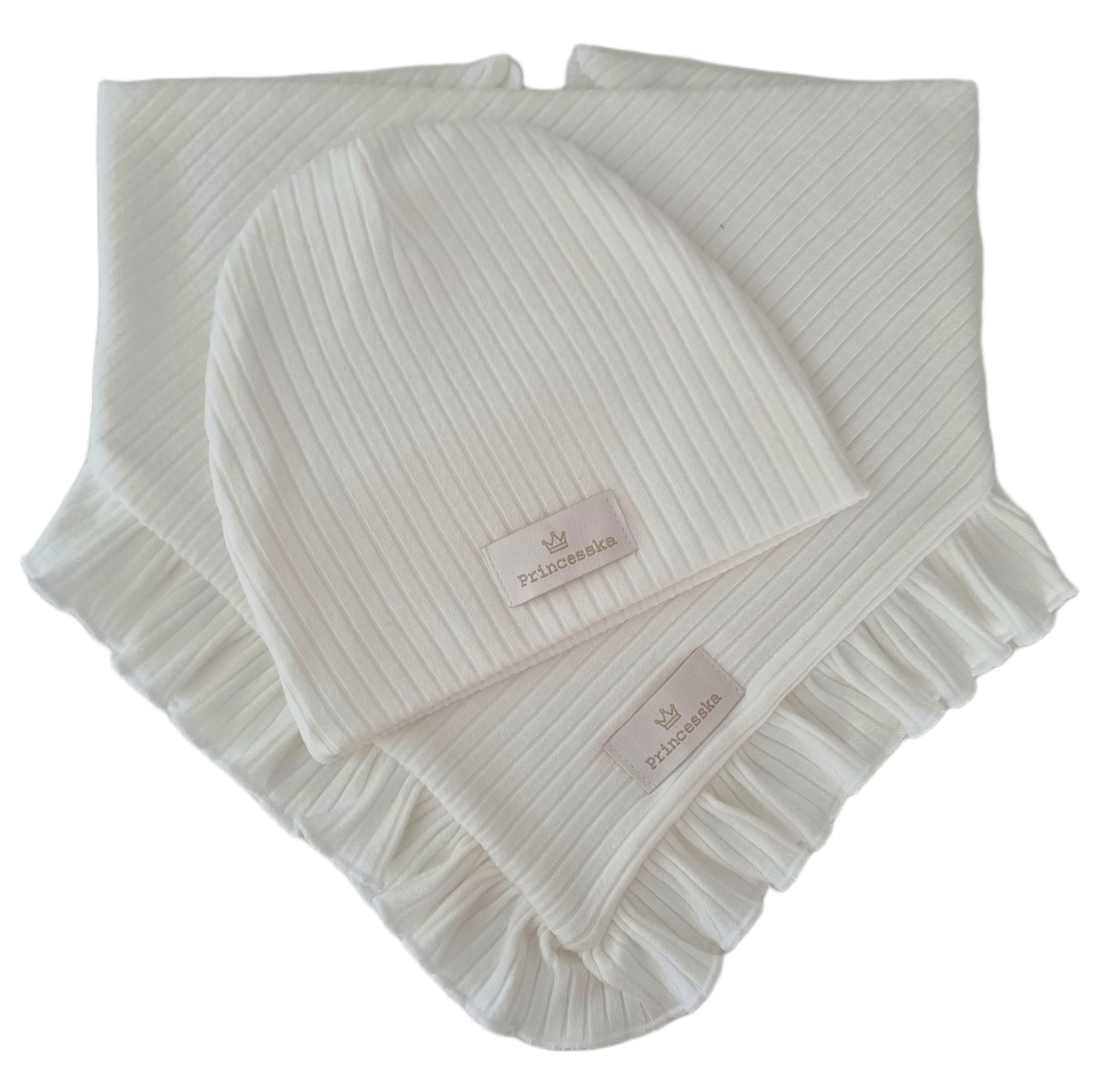 KOMPLET CZAPKA I CHUSTA Z FALBANKĄ sweterek prążek Ecru