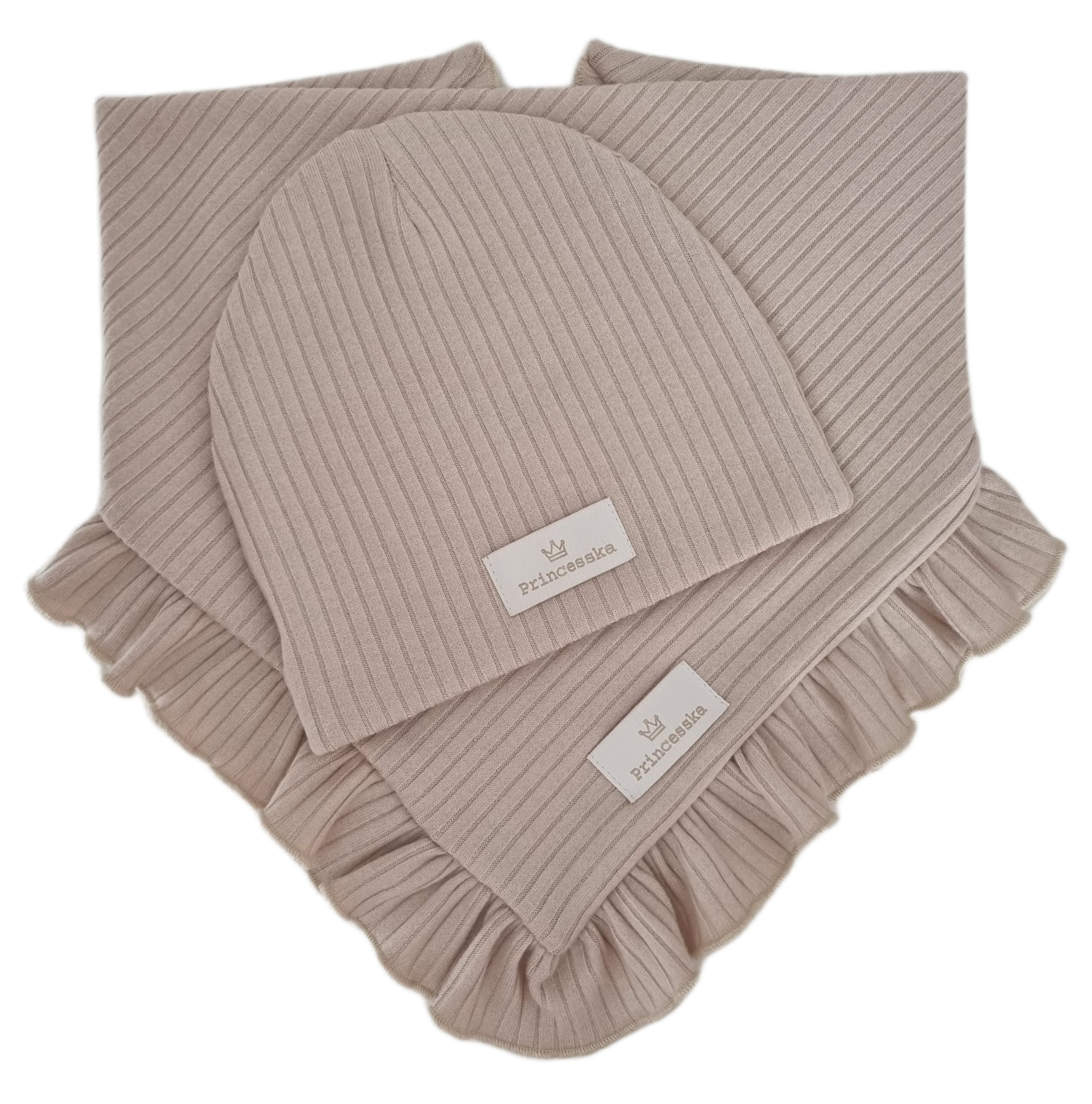 KOMPLET CZAPKA I CHUSTA Z FALBANKĄ sweterek prążek Jasny Beż