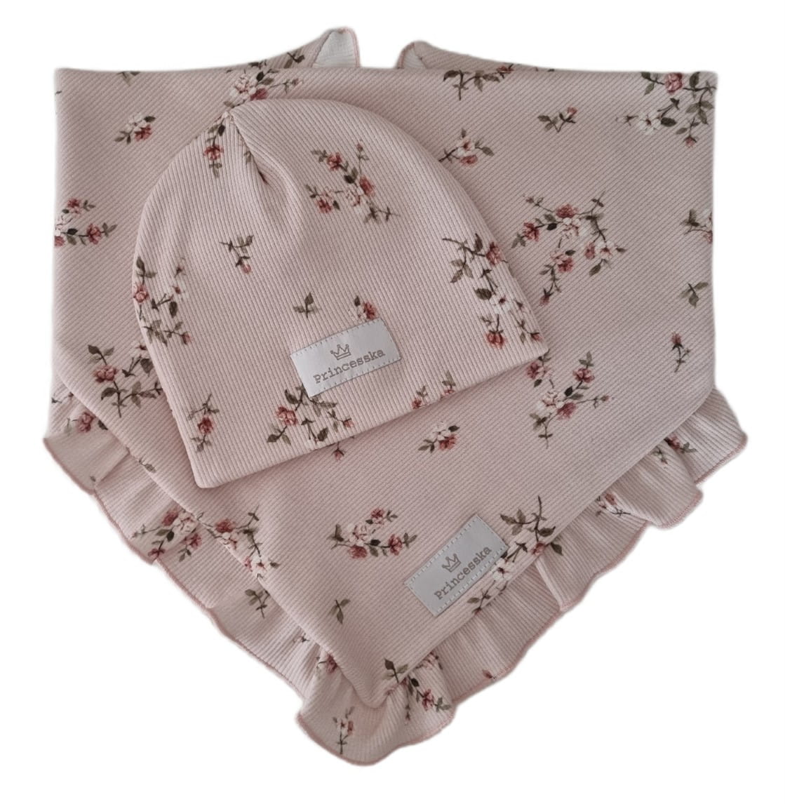 KOMPLET PRINCESSKA CZAPKA I CHUSTA Z FALBANKĄ Drobne Różyczki Róż