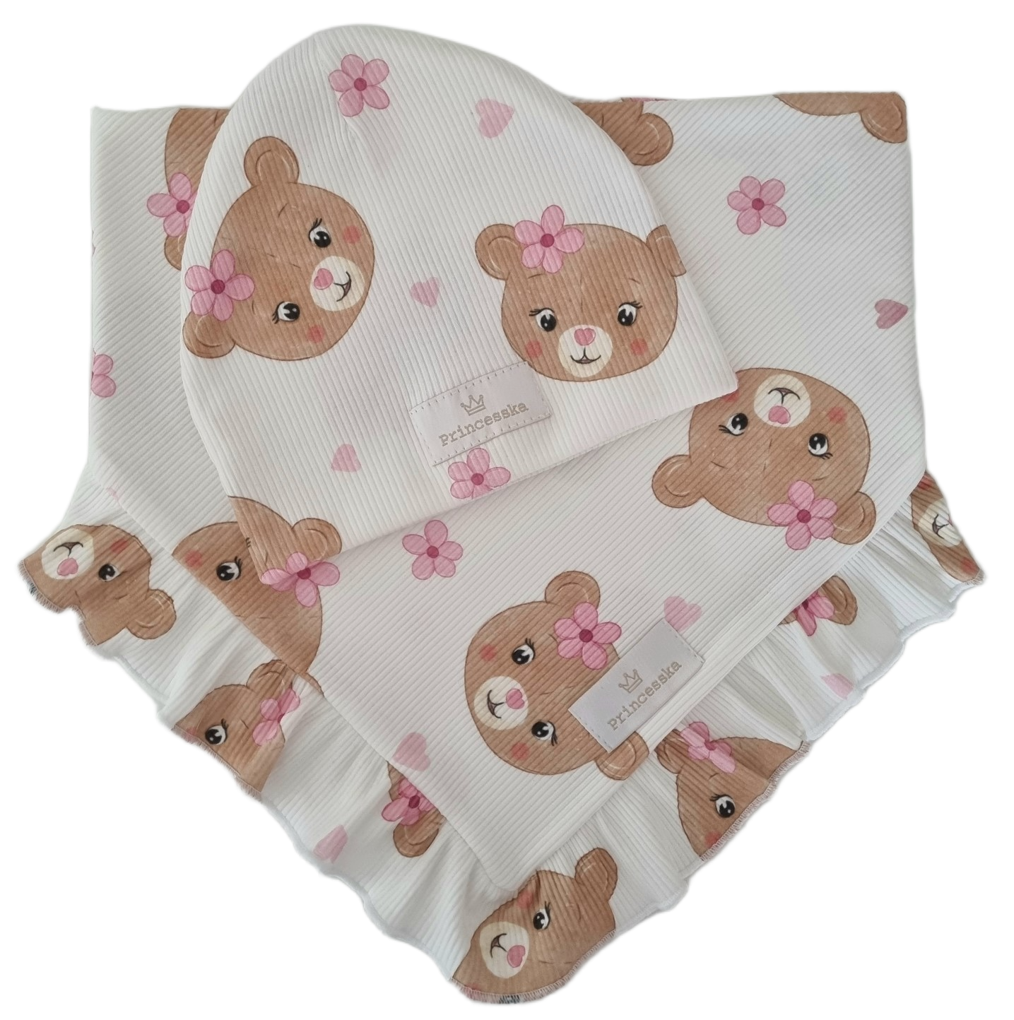 KOMPLET PRINCESSKA CZAPKA I CHUSTA Z FALBANKĄ Misie na Bieli