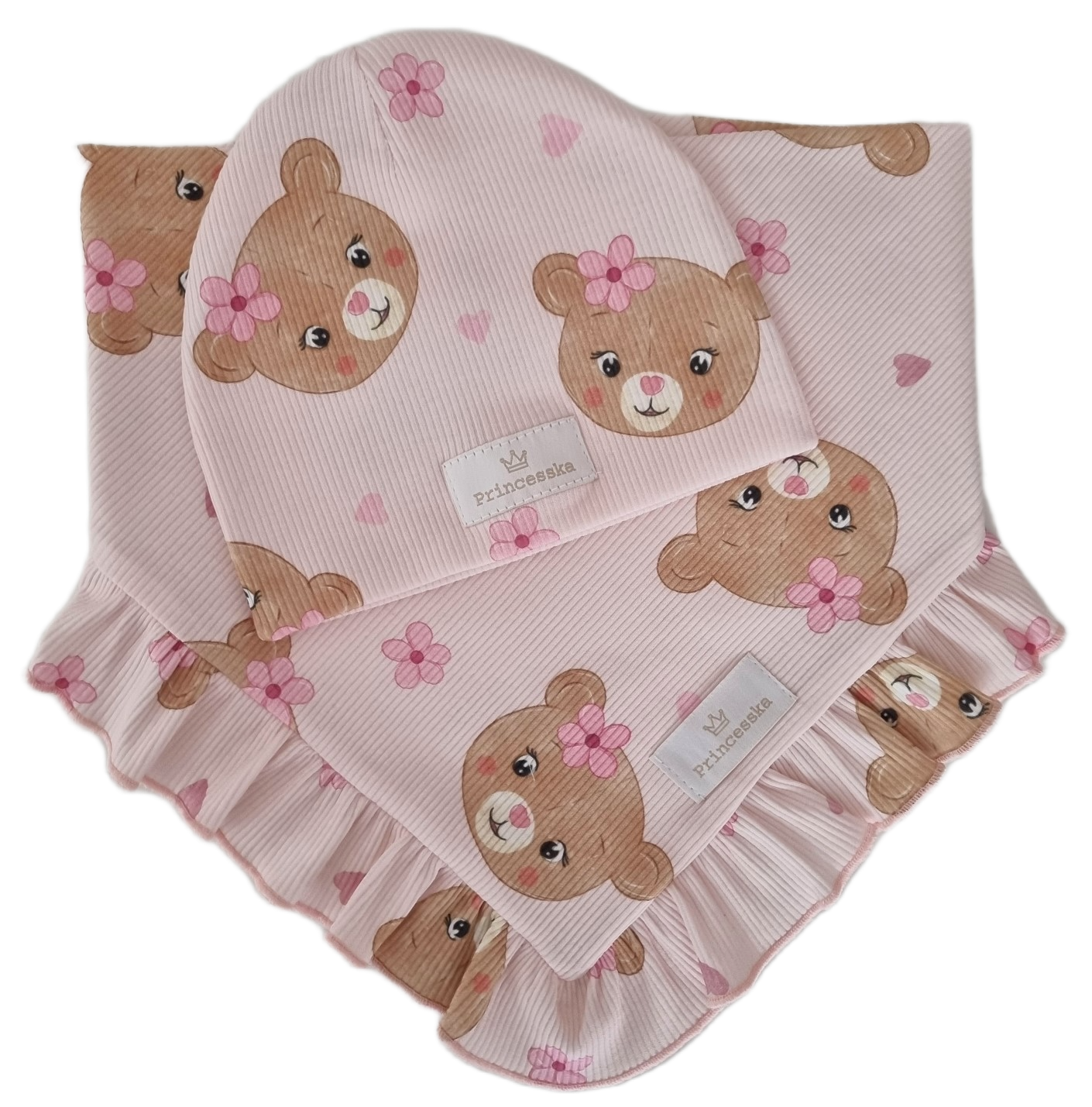 KOMPLET PRINCESSKA CZAPKA I CHUSTA Z FALBANKĄ Misie na Różu