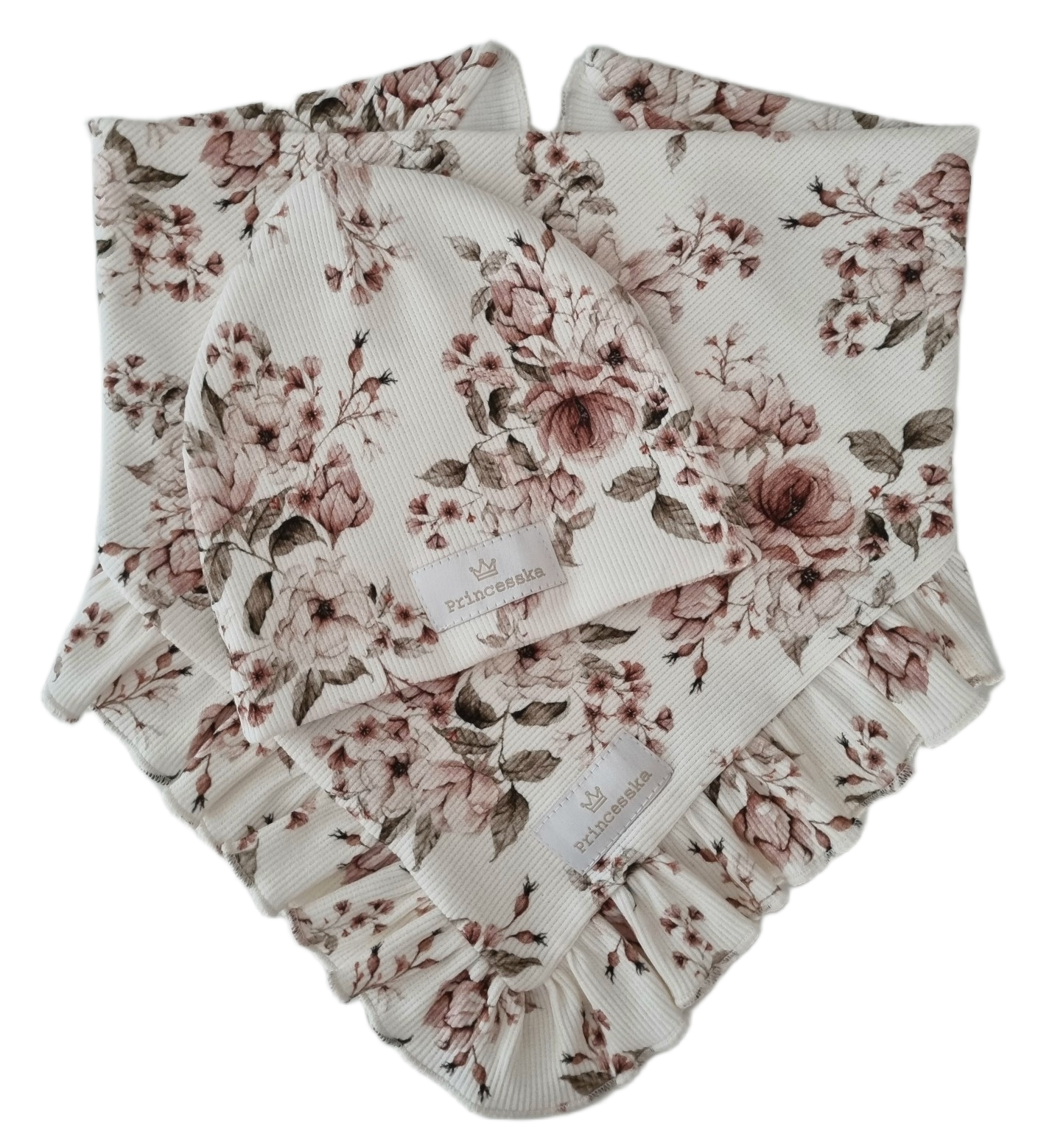 KOMPLET PRINCESSKA CZAPKA I CHUSTA Z FALBANKĄ Vintage Flowers Biel