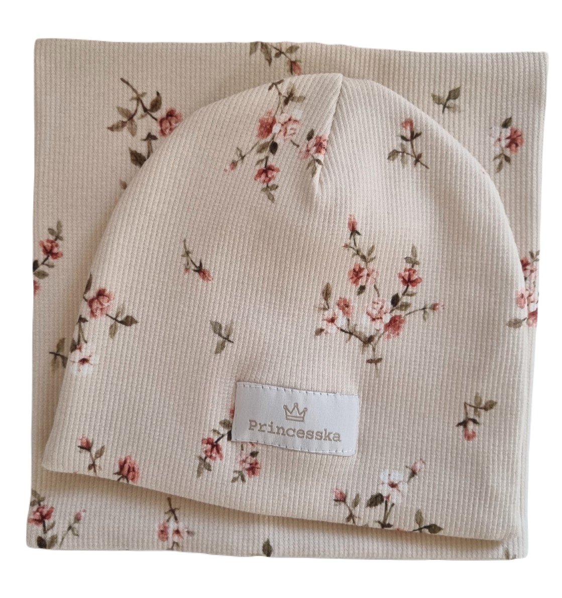 KOMPLET PRINCESSKA CZAPKA I KOMIN Drobne Różyczki Beż