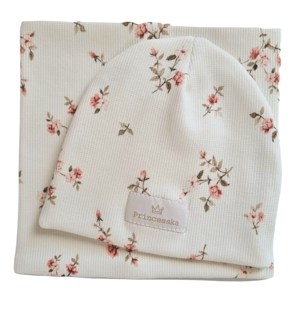 KOMPLET PRINCESSKA CZAPKA I KOMIN Drobne Różyczki Biel