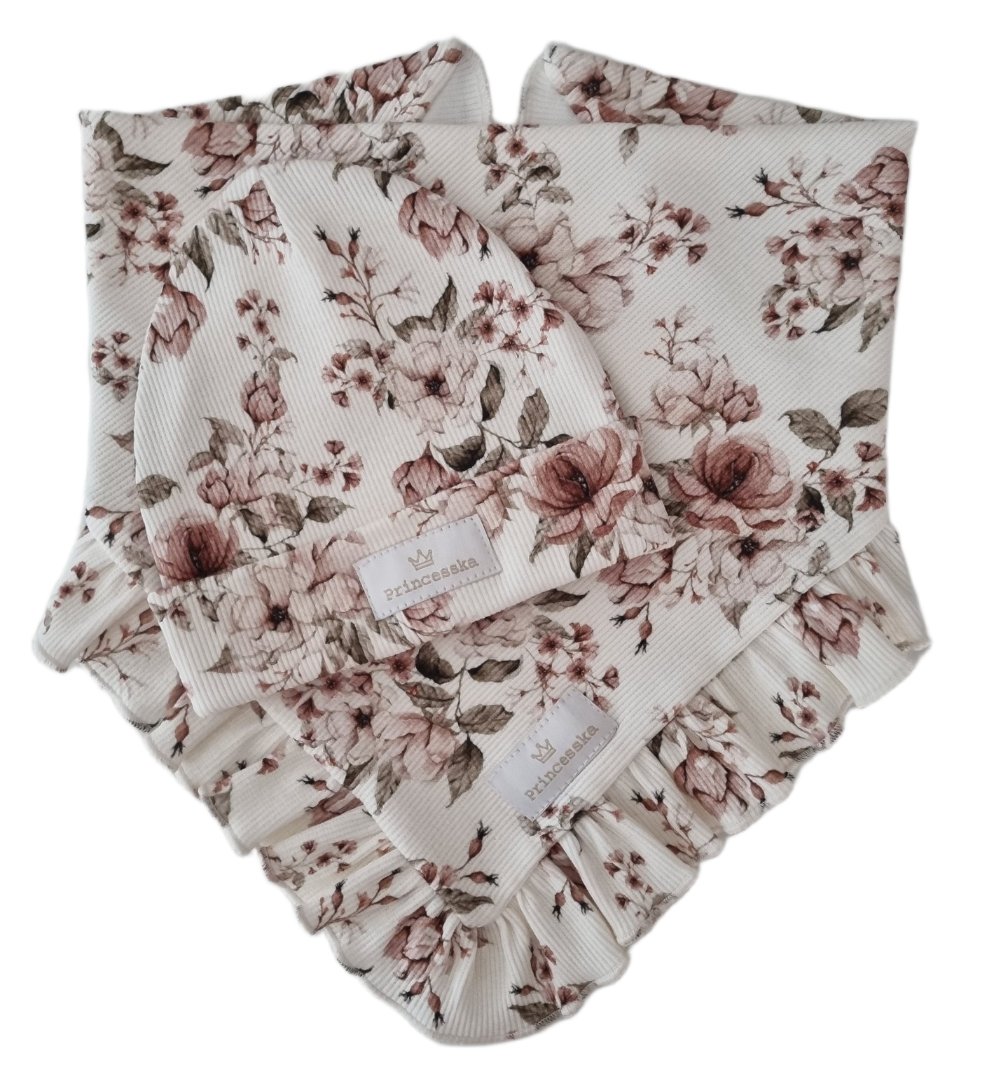 KOMPLET PRINCESSKA CZAPKA WYWIJANA I CHUSTA Z FALBANKĄ Vintage Flowers Biel