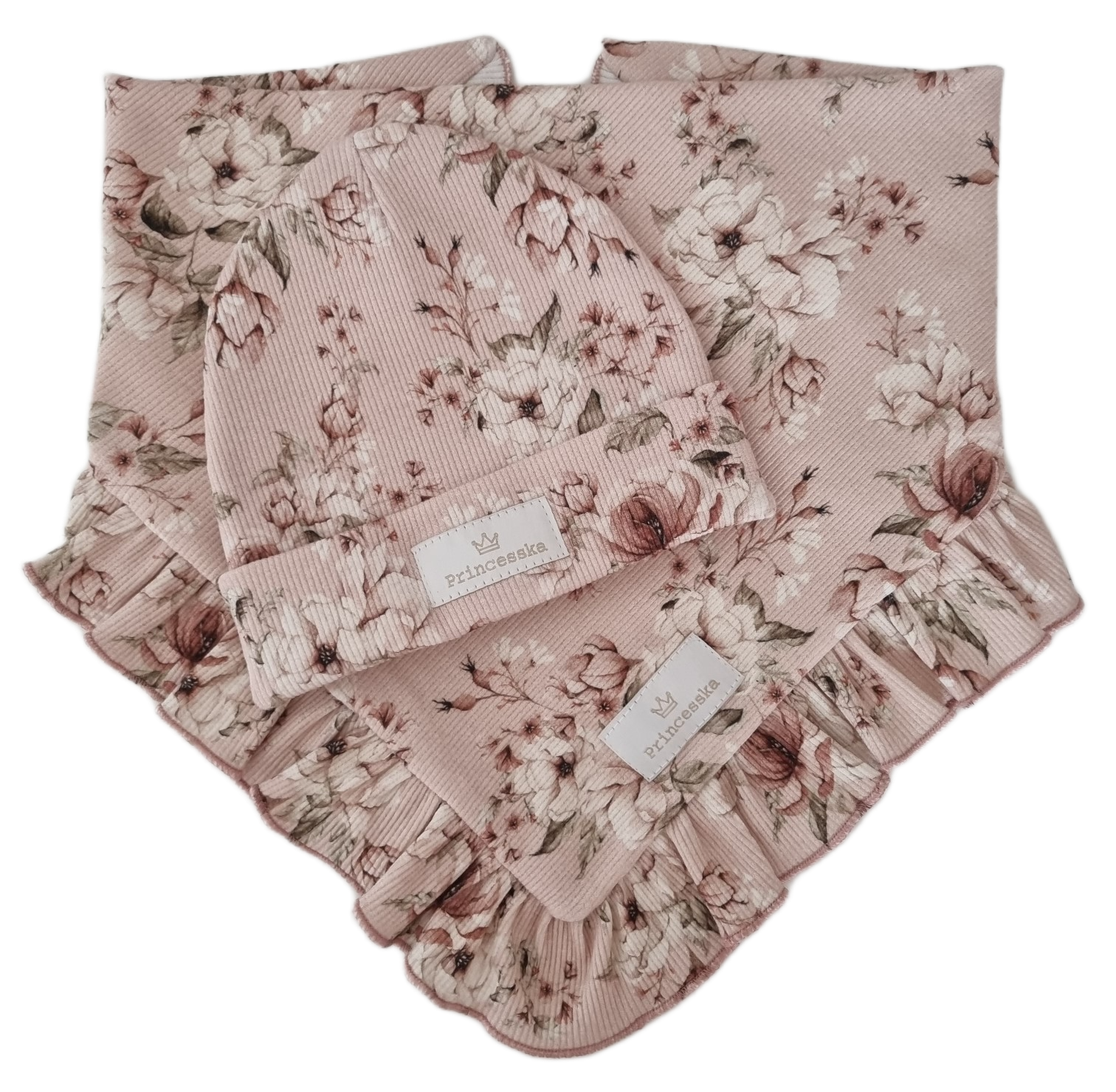 KOMPLET PRINCESSKA CZAPKA WYWIJANA I CHUSTA Z FALBANKĄ Vintage Flowers Róż