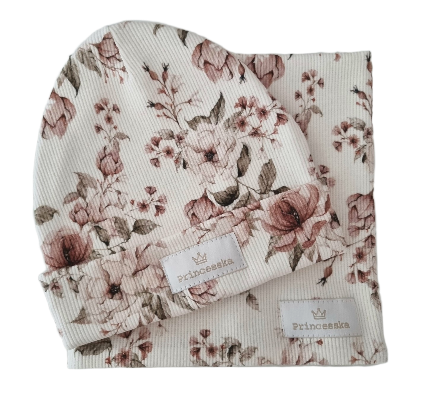 KOMPLET PRINCESSKA CZAPKA WYWIJANA I KOMIN Vintage Flowers Biel
