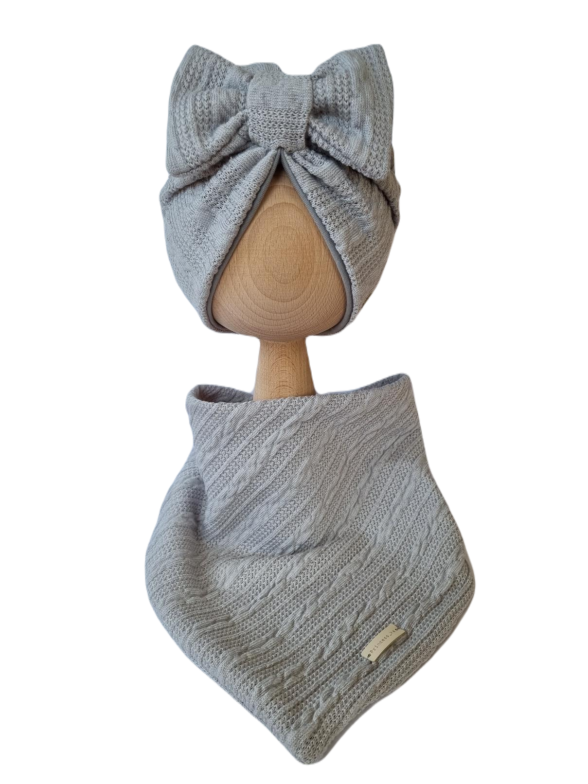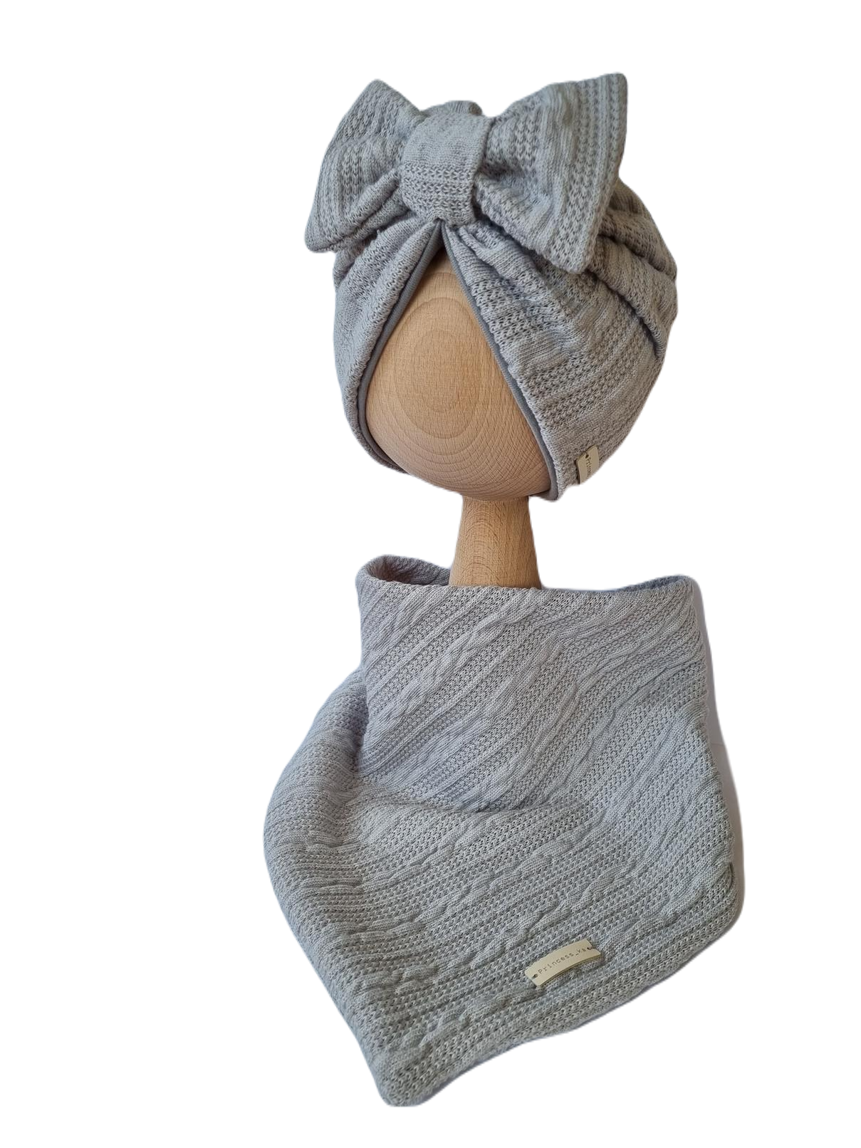 KOMPLET SWETERKOWY TURBAN PODWÓJNY KOKARDA I CHUSTA Grafit