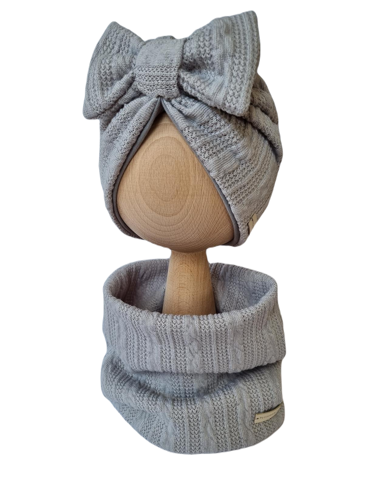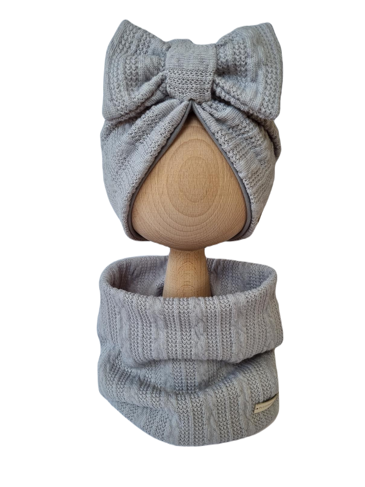 KOMPLET SWETERKOWY TURBAN PODWÓJNY KOKARDA I KOMIN Grafit