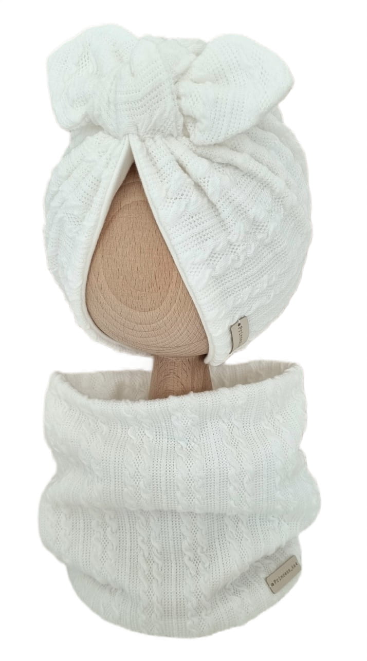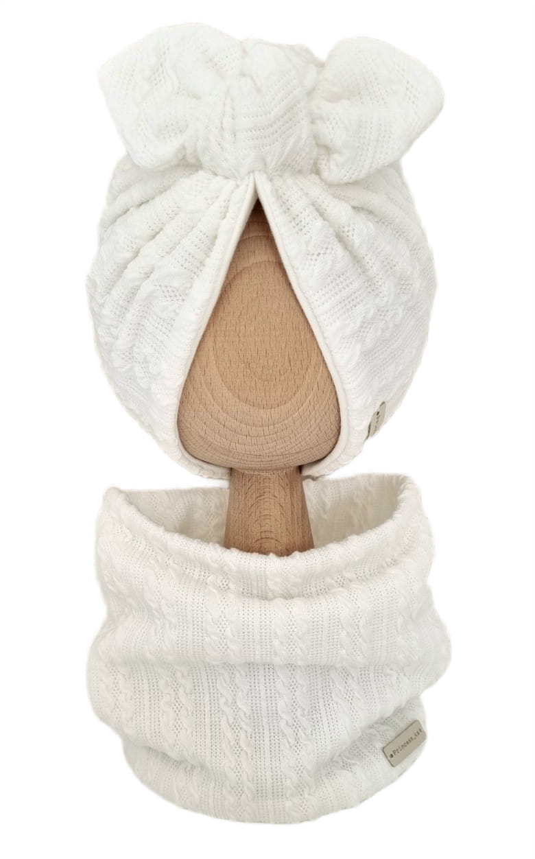 KOMPLET SWETERKOWY TURBAN PODWÓJNY MOTYLEK I KOMIN Śmietankowa Biel