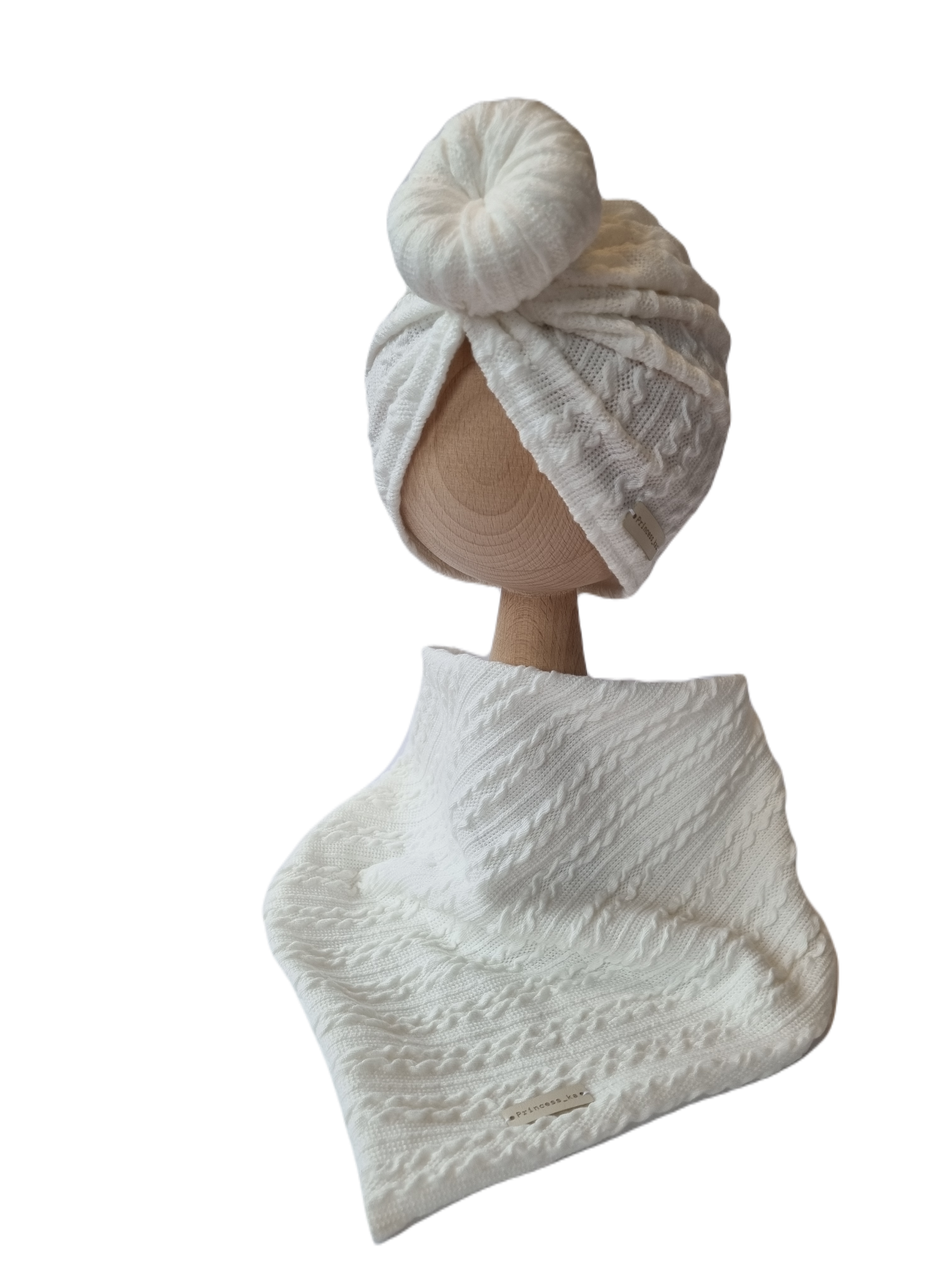 KOMPLET SWETERKOWY TURBAN POJEDYNCZY DONUT I CHUSTA Śmietankowa Biel