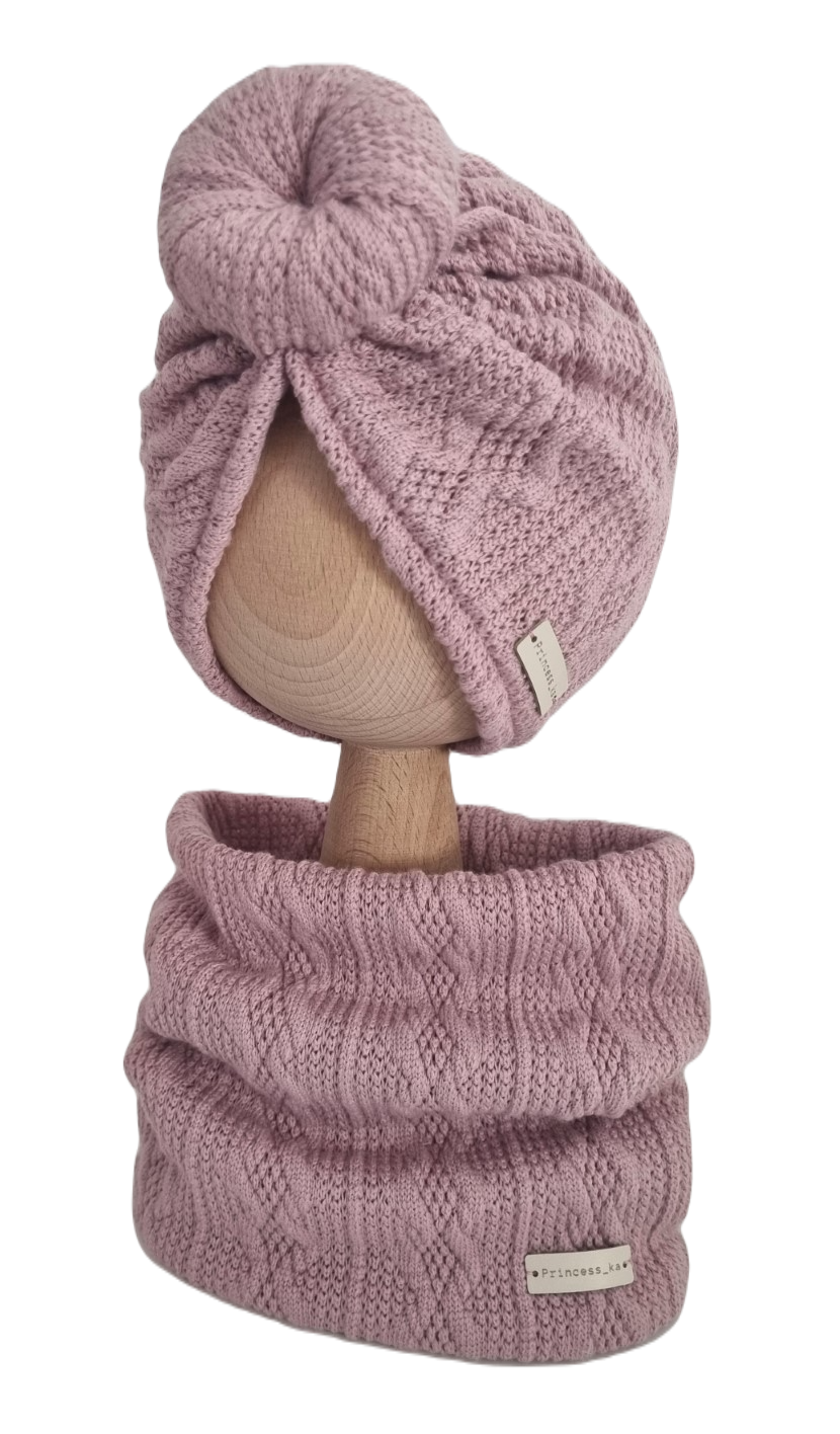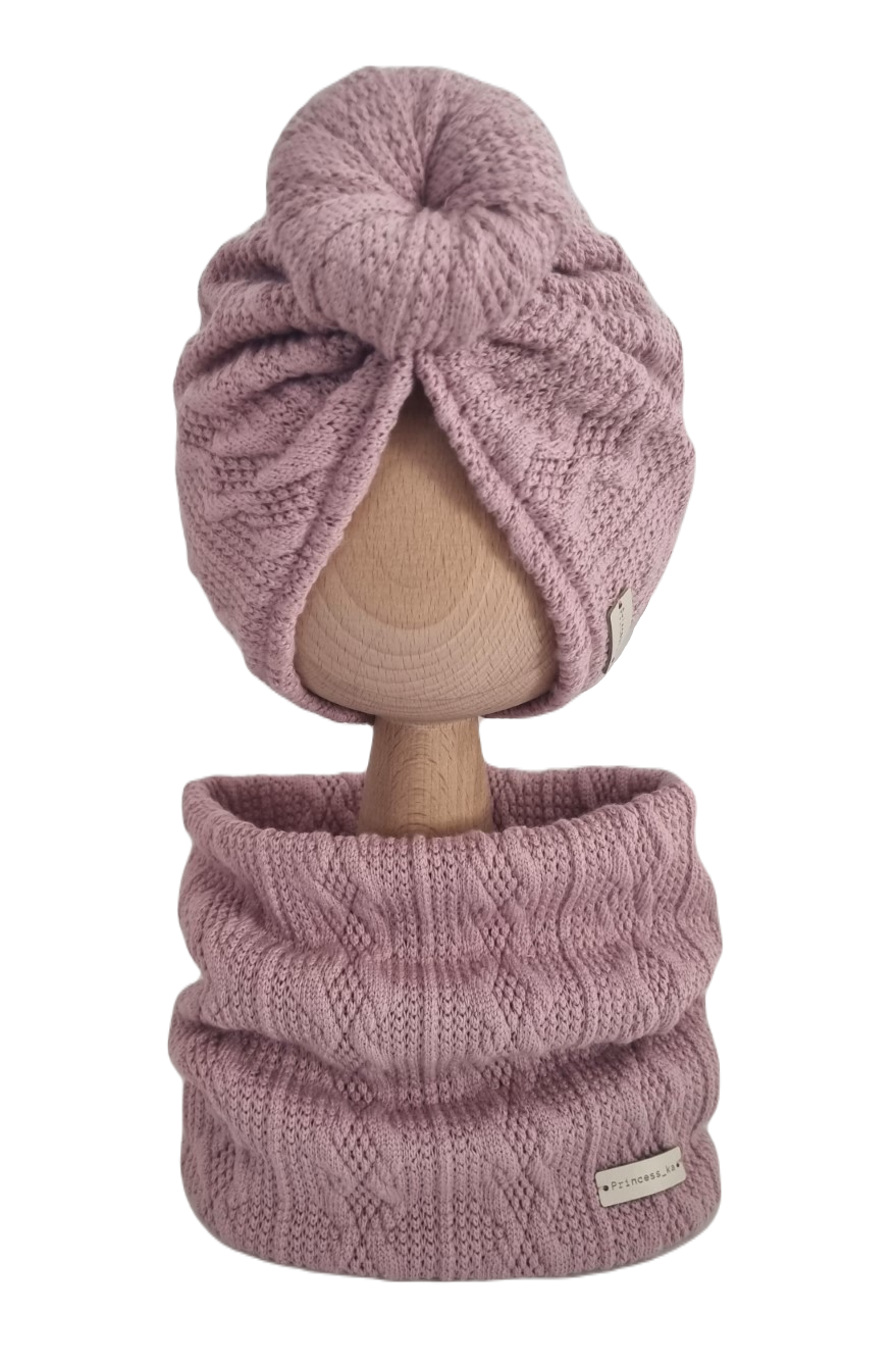 KOMPLET SWETERKOWY TURBAN POJEDYNCZY DONUT I KOMIN Pudrowy Róż