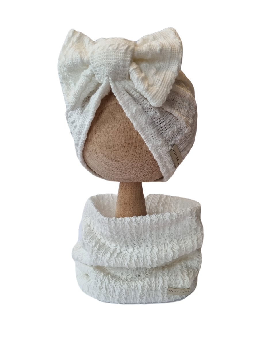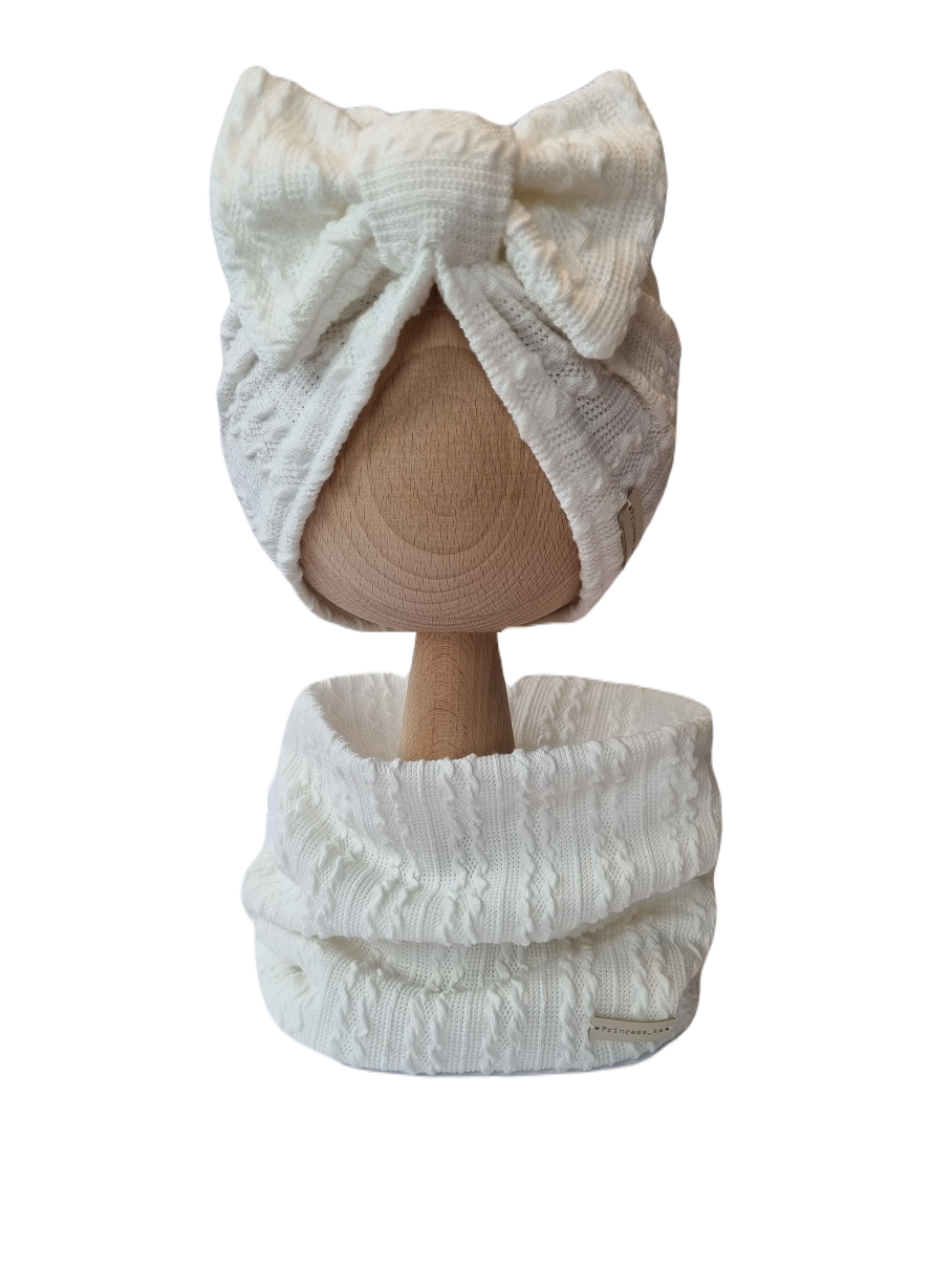 KOMPLET SWETERKOWY TURBAN POJEDYNCZY KOKARDA I KOMIN Śmietankowa Biel