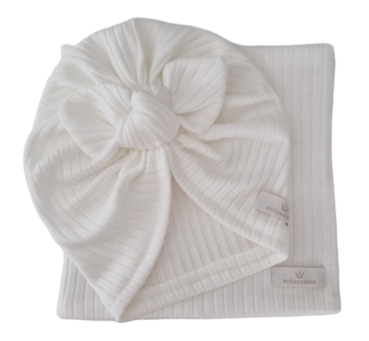 KOMPLET TURBAN MOTYLEK I KOMIN sweterek prążek Ecru