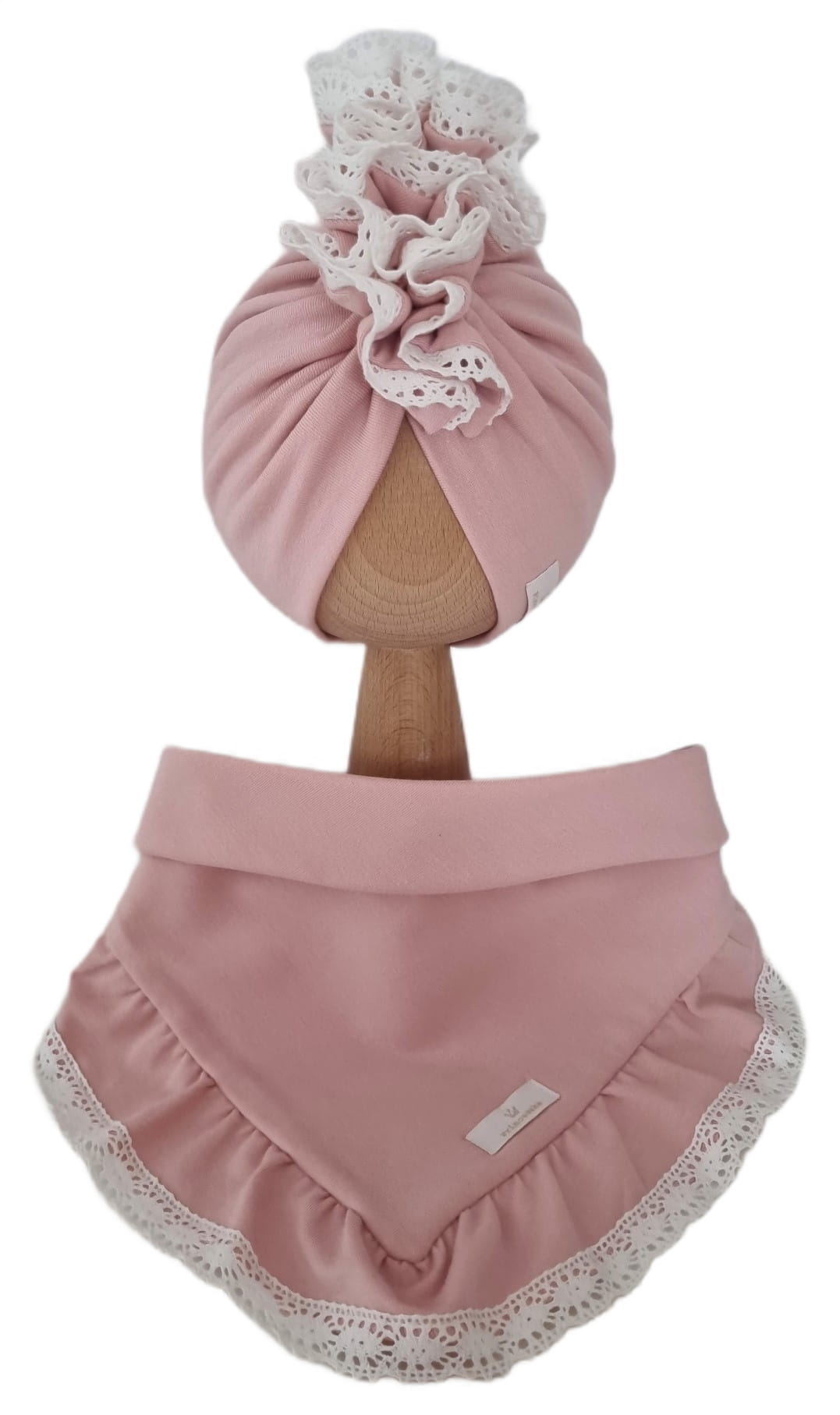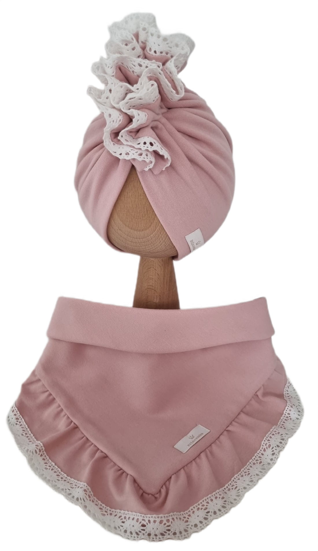 KOMPLET TURBAN PODWÓJNY FALBANKA I CHUSTA Z FALBANKĄ - KORONKA Jasny Róż