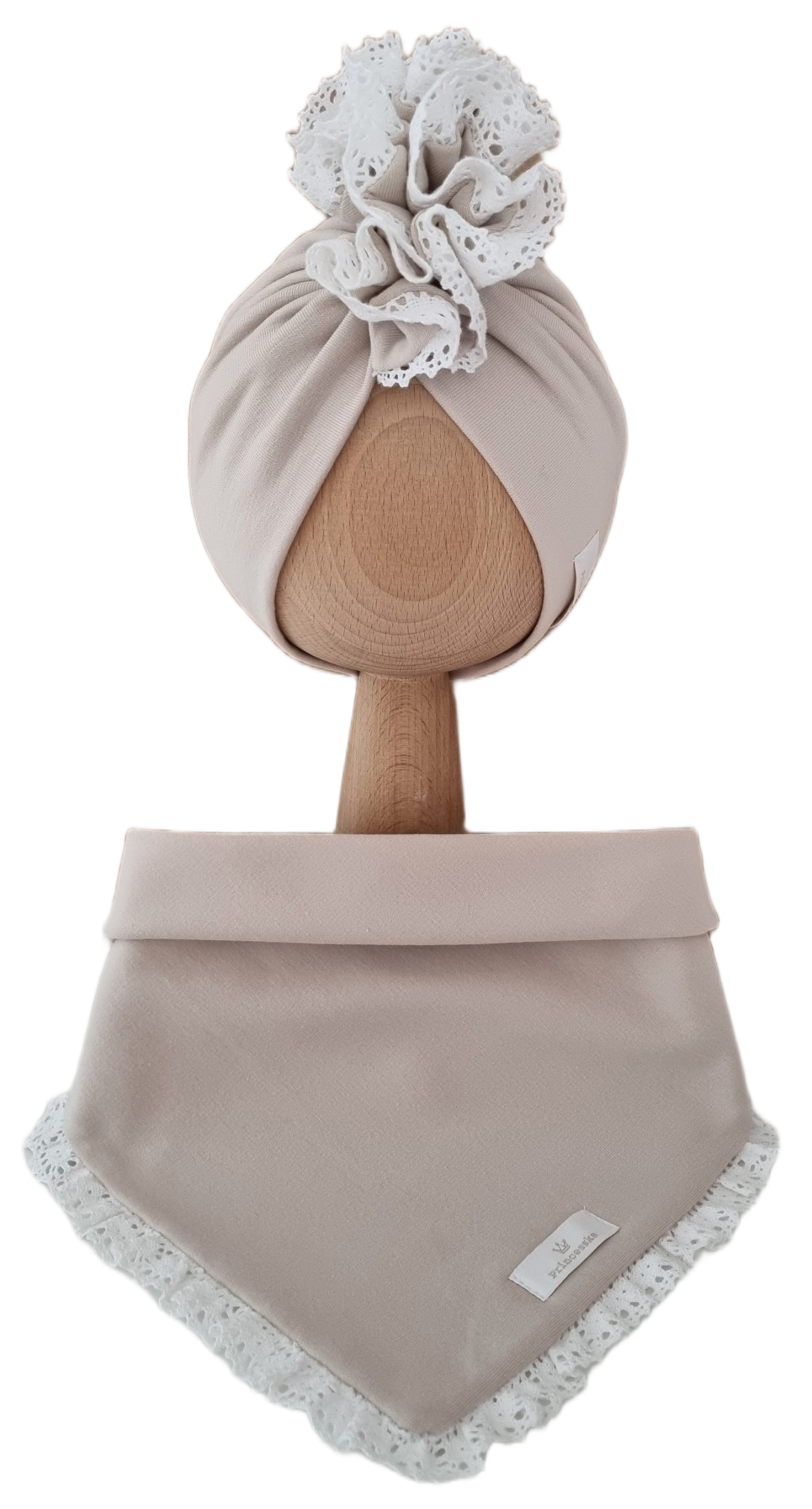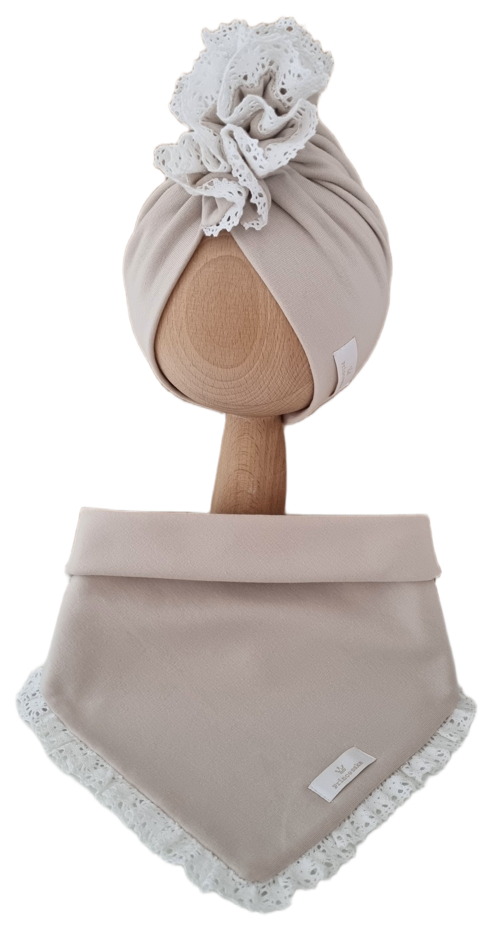 KOMPLET TURBAN PODWÓJNY FALBANKA I CHUSTA Z KORONKĄ Jasny Beż