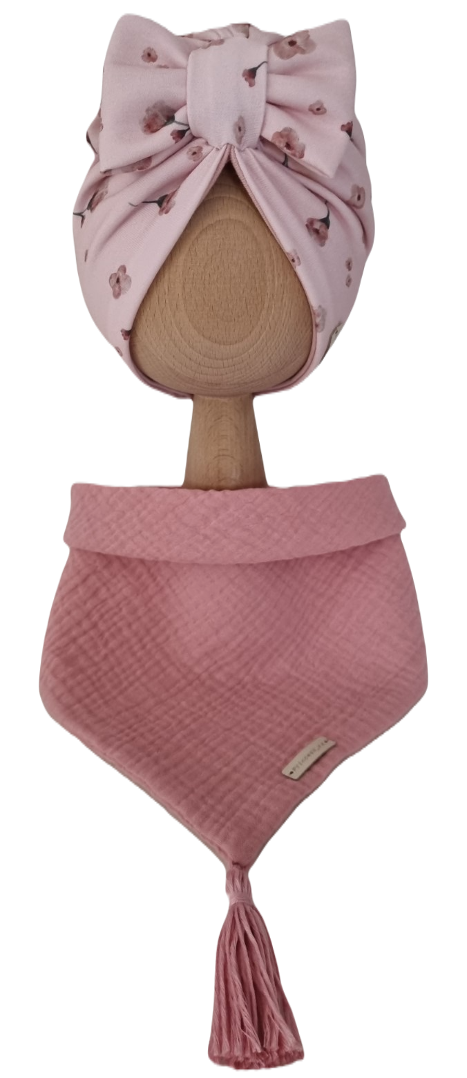 KOMPLET TURBAN PODWÓJNY KOKARDA Fiołki na Różu I CHUSTA Muślinowa Pudrowy Róż Z CHWOSTAMI Róż