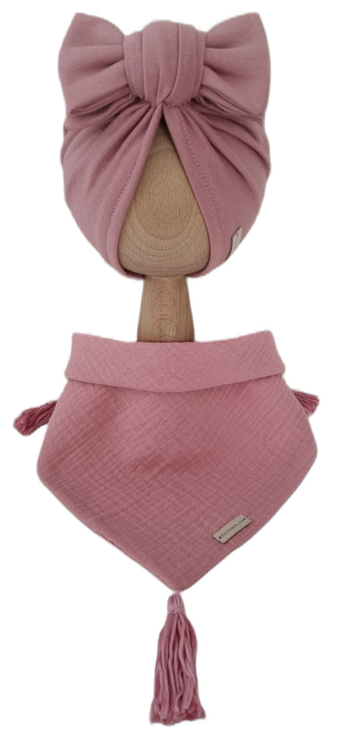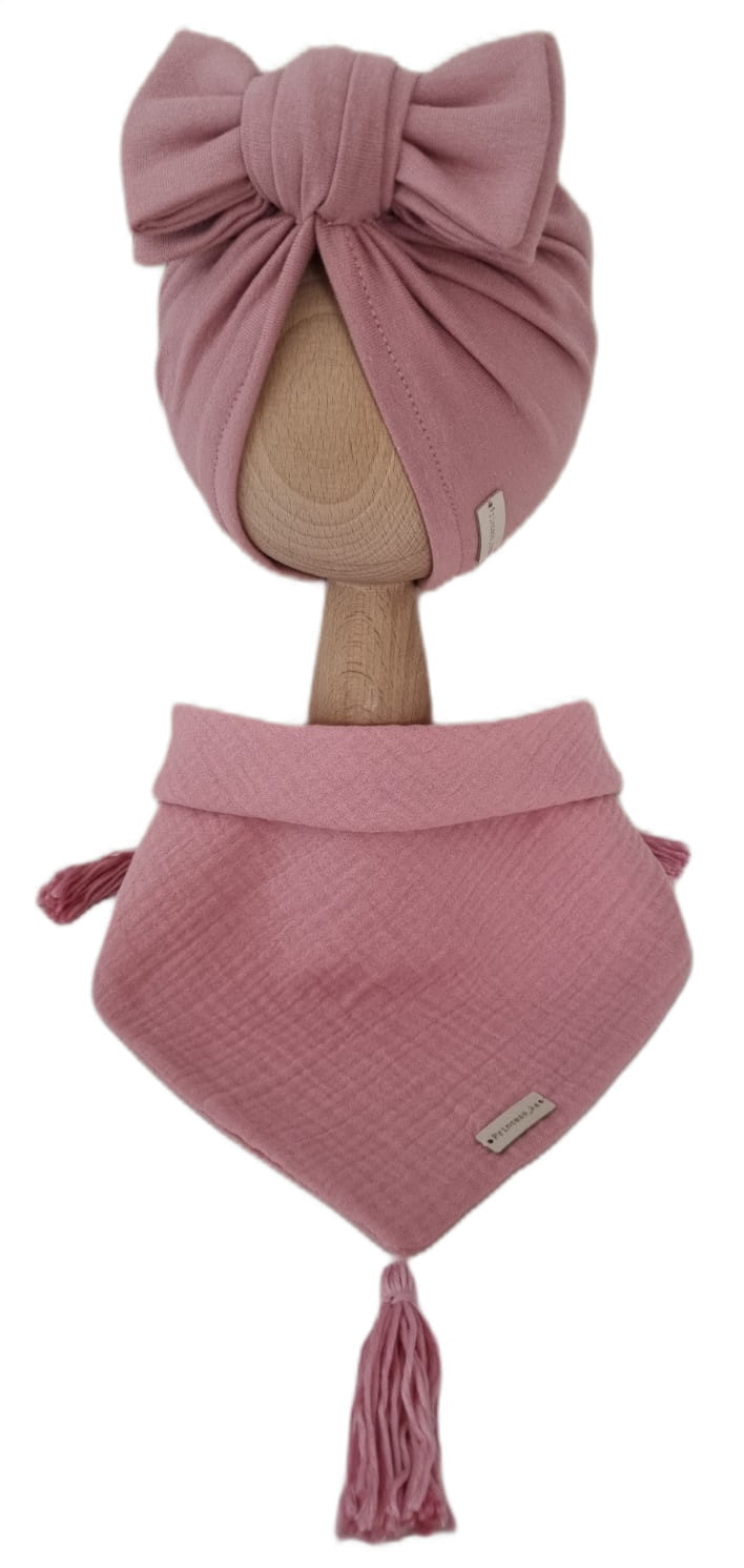 KOMPLET TURBAN POJEDYNCZY BIG BOW Pudrowy Róż I CHUSTA Z CHWOSTAMI Muślinowa Pudrowy Róż
