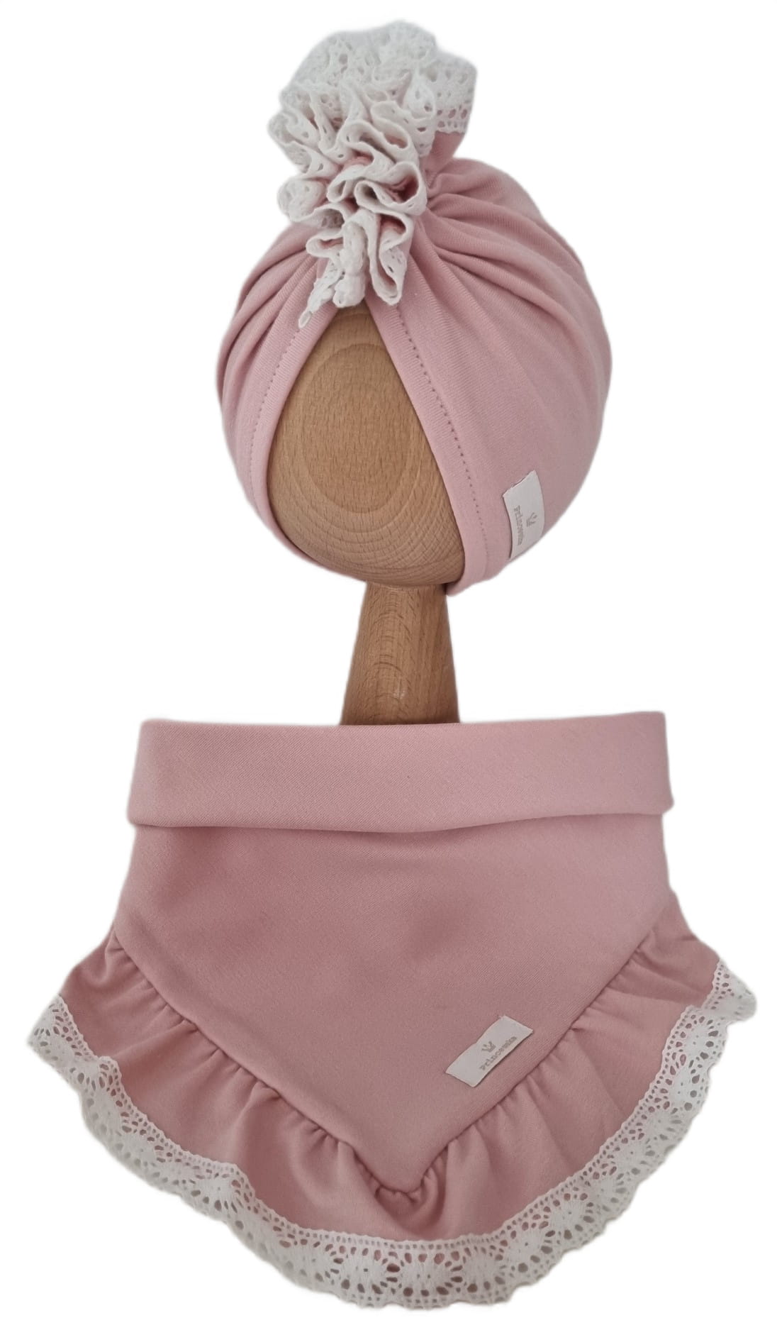 KOMPLET TURBAN POJEDYNCZY FALBANKA I CHUSTA Z FALBANKĄ - KORONKA Jasny Róż