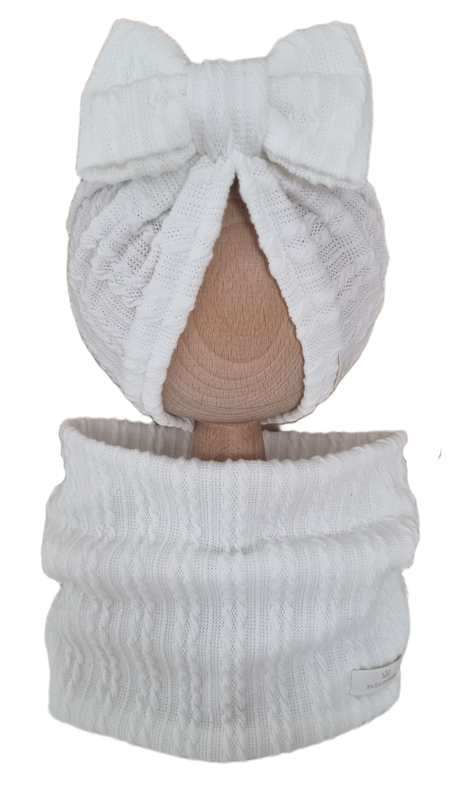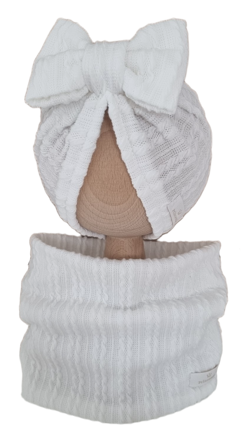 KOMPLET TURBAN POJEDYNCZY KOKARDA I KOMIN SWETEREK WARKOCZ Ecru