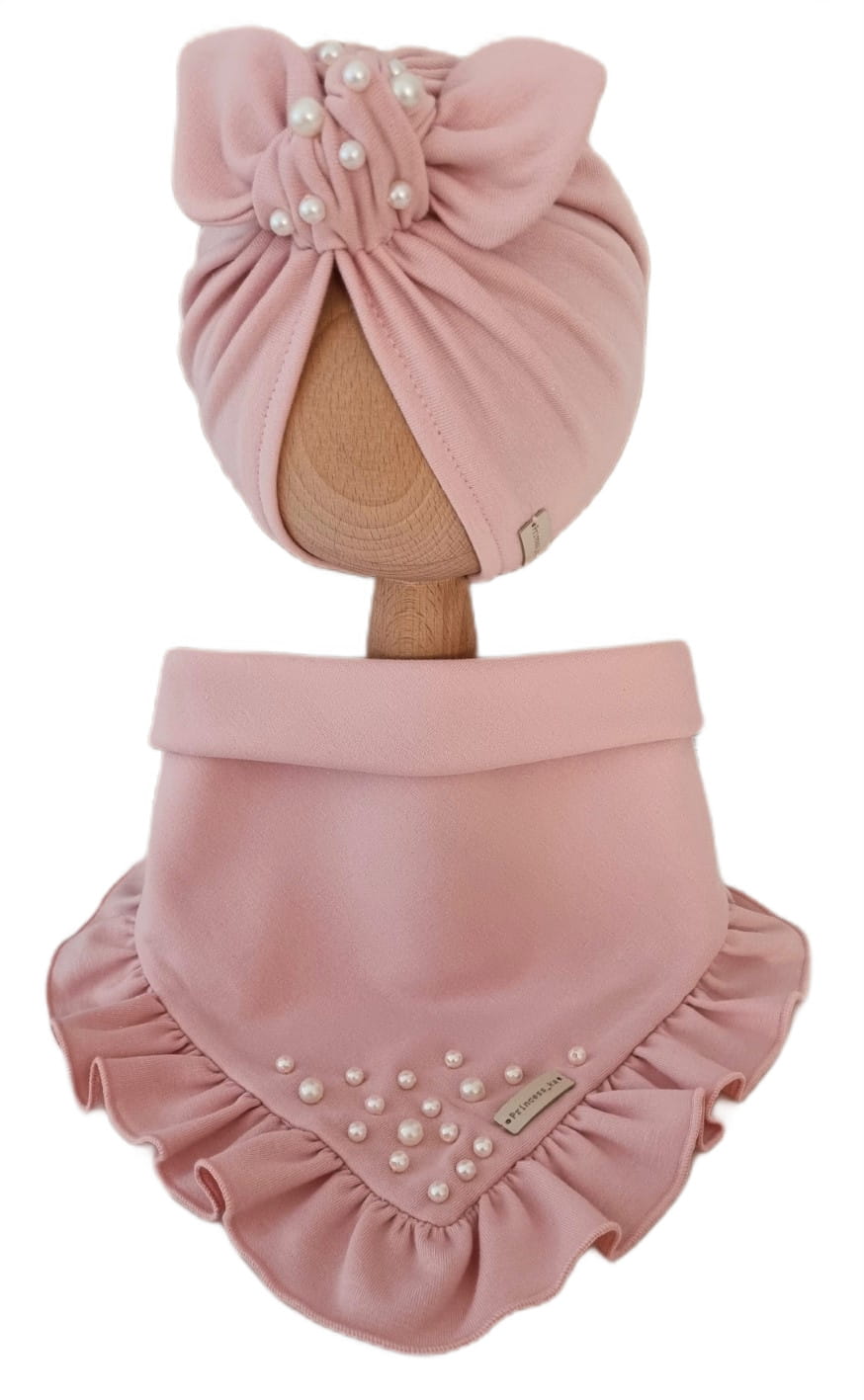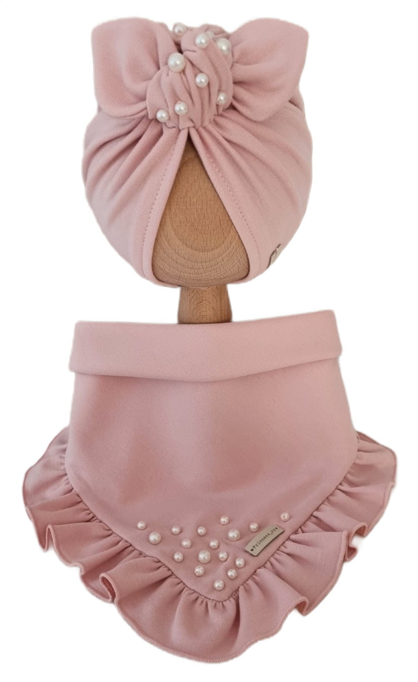 KOMPLET Z KORALIKAMI TURBAN POJEDYNCZY I CHUSTA Z FALBANKĄ Jasny Róż