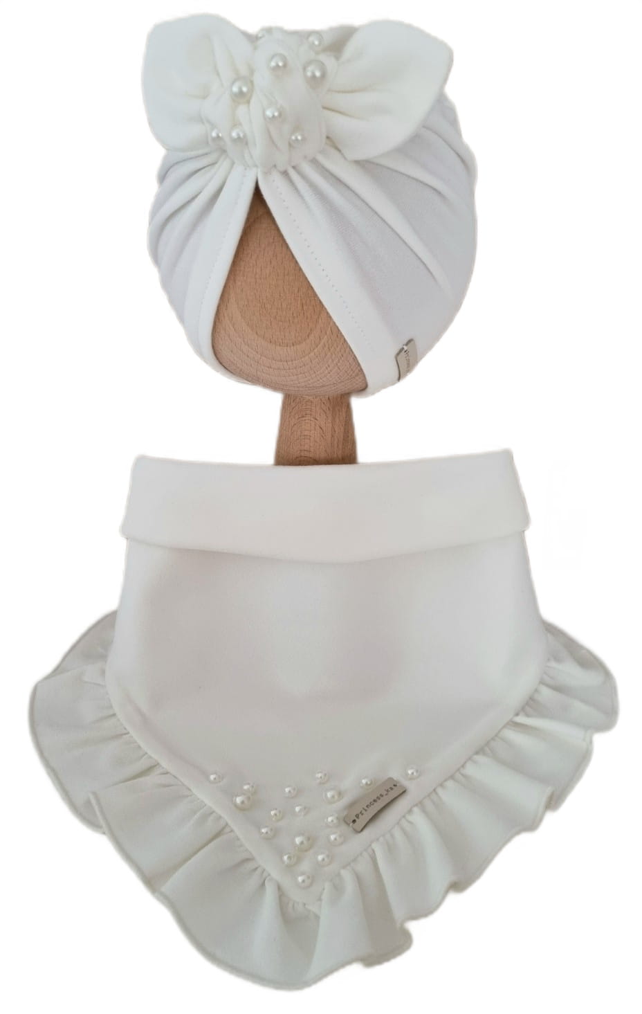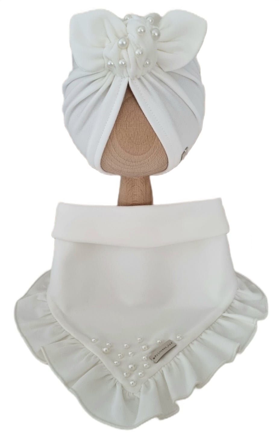 KOMPLET Z KORALIKAMI TURBAN POJEDYNCZY I CHUSTA Z FALBANKĄ Śmietankowa Biel