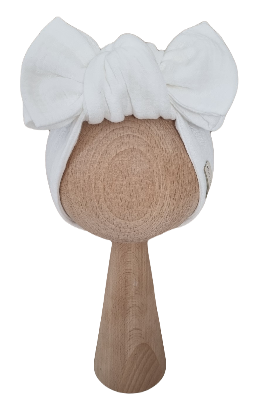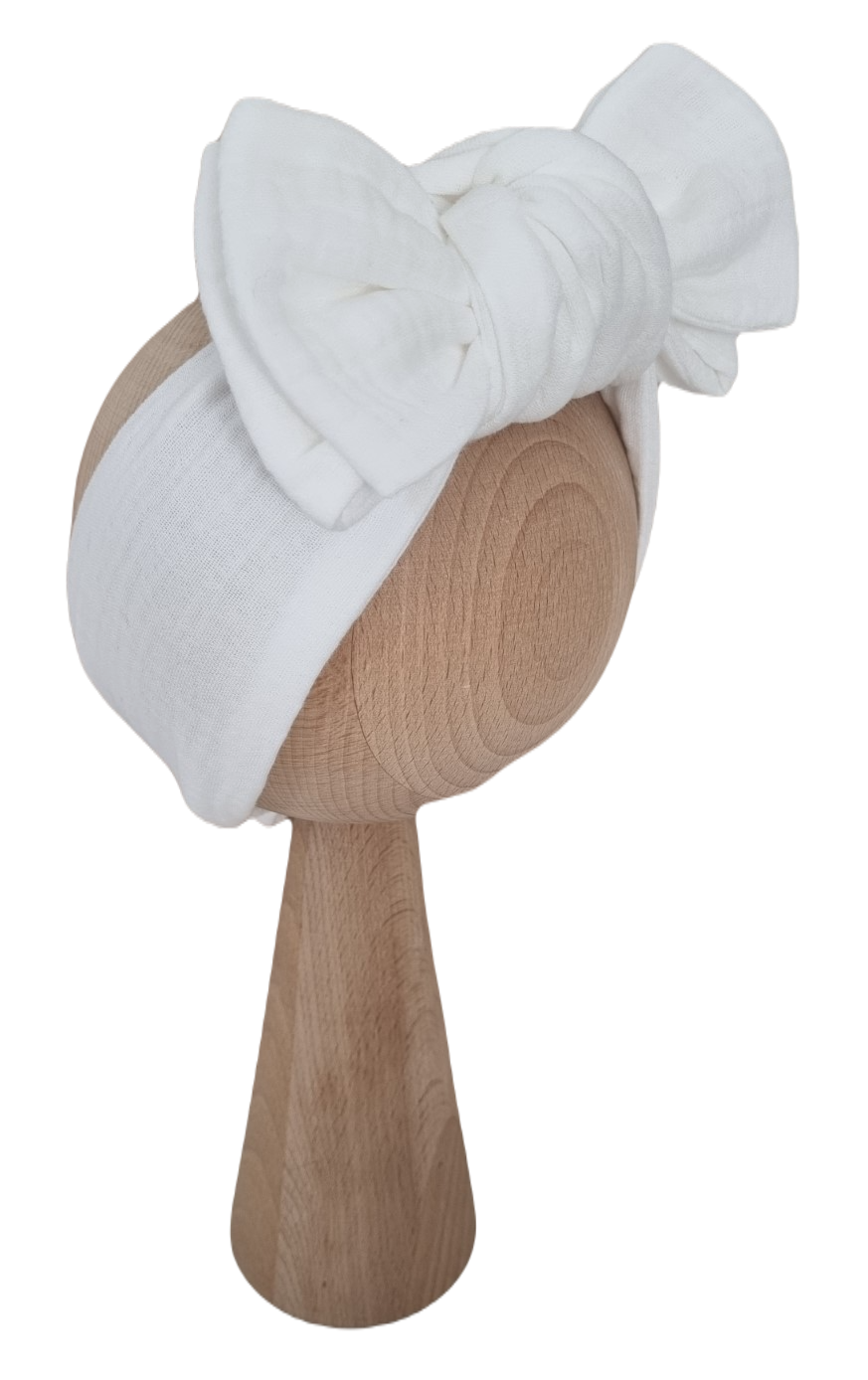 MUŚLINOWA OPASKA KOKARDA - opaska wywiązana w piękną kokardę, która doda uroku każdej maleńkiej główce.