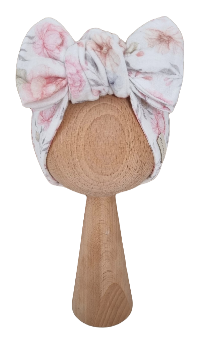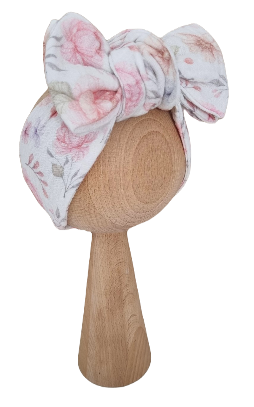 MUŚLINOWA OPASKA KOKARDA - opaska wywiązana w piękną kokardę, która doda uroku każdej maleńkiej główce.