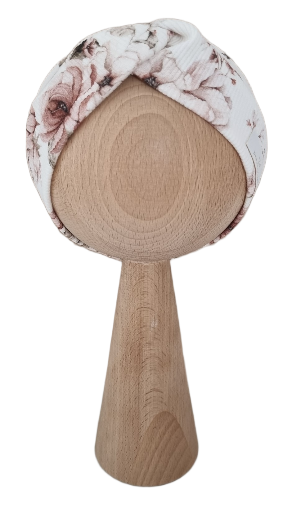 KOMPLET TURBAN POJEDYNCZY DONUT Magnolie na Bieli I CHUSTA Muślinowa Ecru Z CHWOSTAMI Pustynny Róż