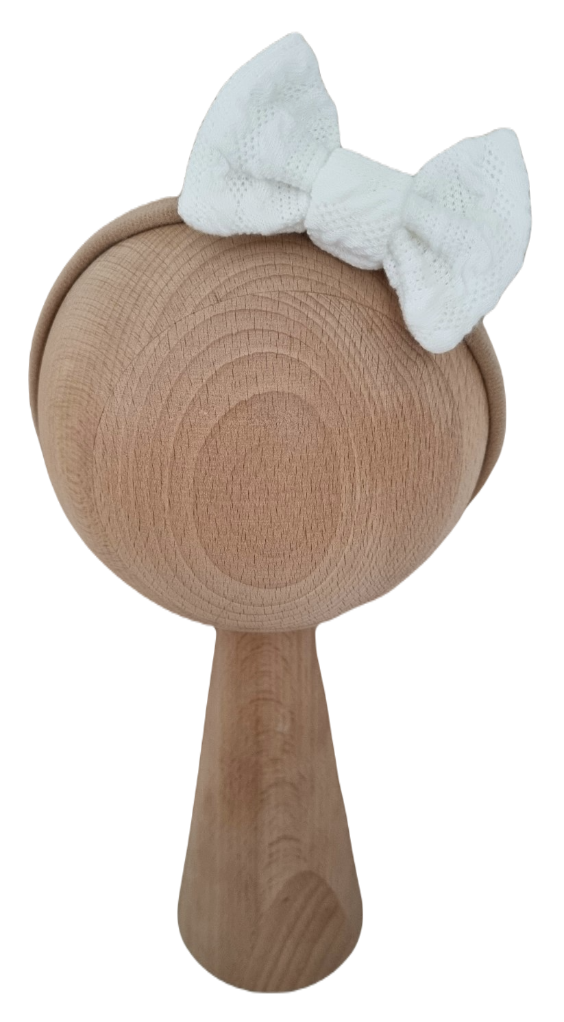 Piękna sweterkowa kokarda o wymiarach 7x4 cm, umocowana na rozciągliwej opasce bezuciskowej, dzięki czemu pasuje zarówno na malutkie jak i większe główki.