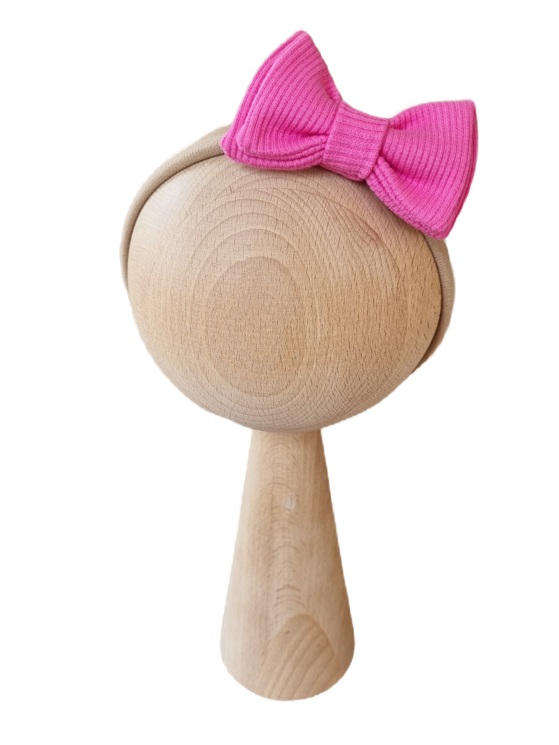 Efektowna kokarda o wymiarach około 5x8 cm, umocowana na rozciągliwej opasce bezuciskowej, dzięki czemu pasuje zarówno na malutkie jak i większe główki.