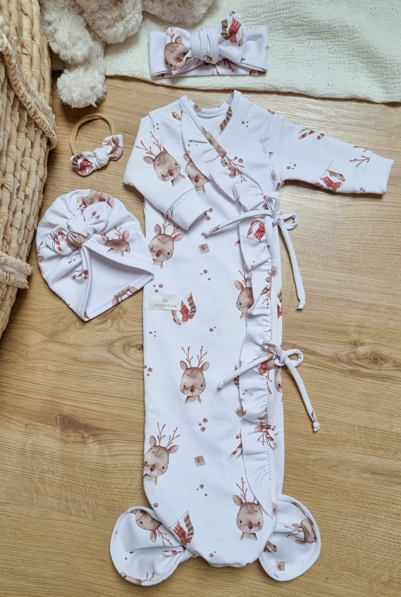 Świąteczny Zestaw Śpiworek Turban MOTYLEK Opaska KOKARDA Opaska bezuciskowa MOTYLEK - Reniferki