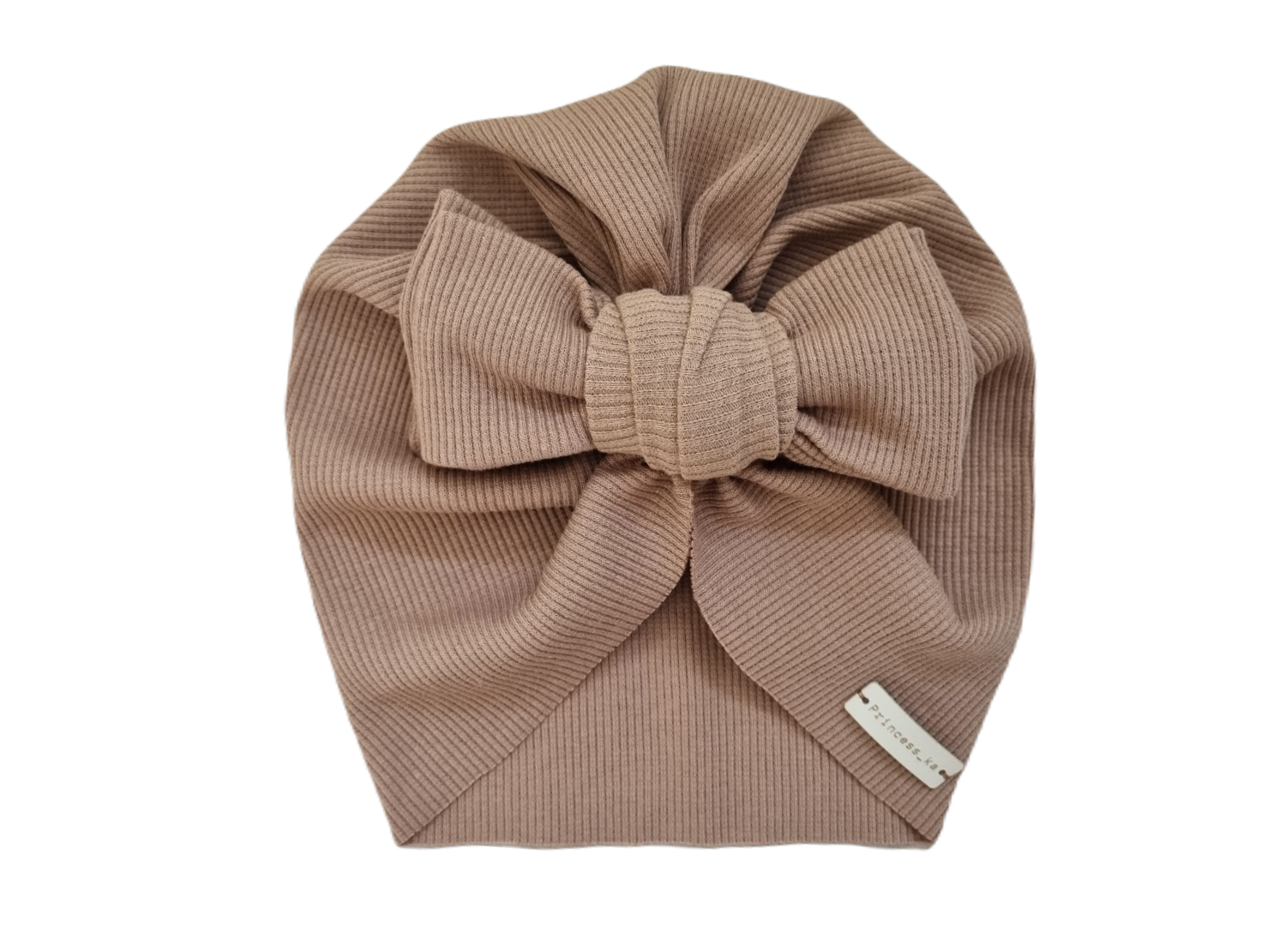Turban wykonany jest z bardzo elastycznej dzianiny prążkowanej, dzięki czemu idealnie dopasuje się do główki dziecka