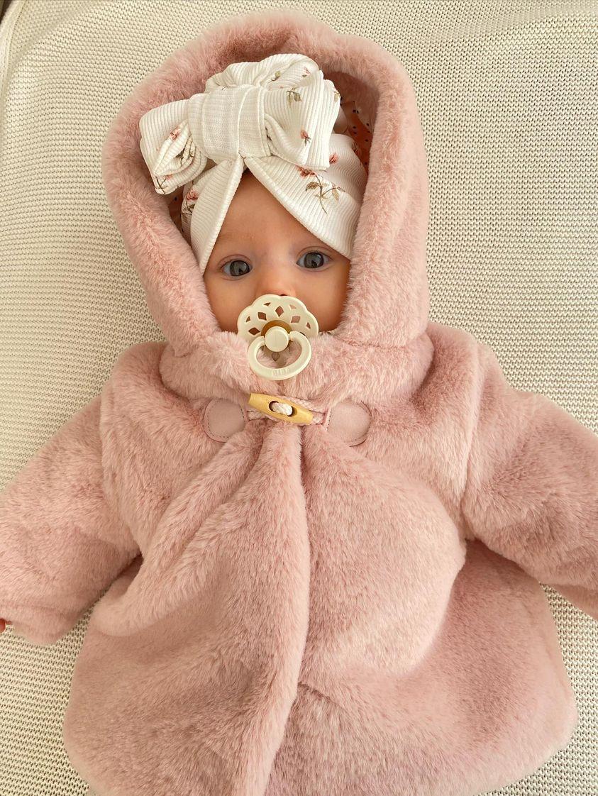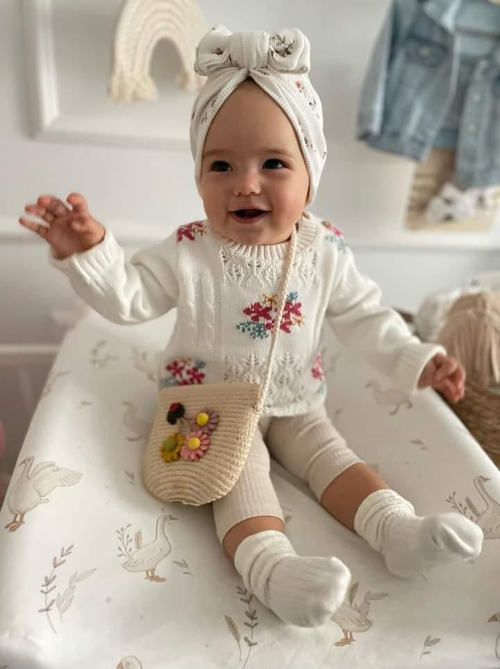 Turban wykonany jest z bardzo elastycznej dzianiny prążkowanej, dzięki czemu idealnie dopasuje się do główki dziecka