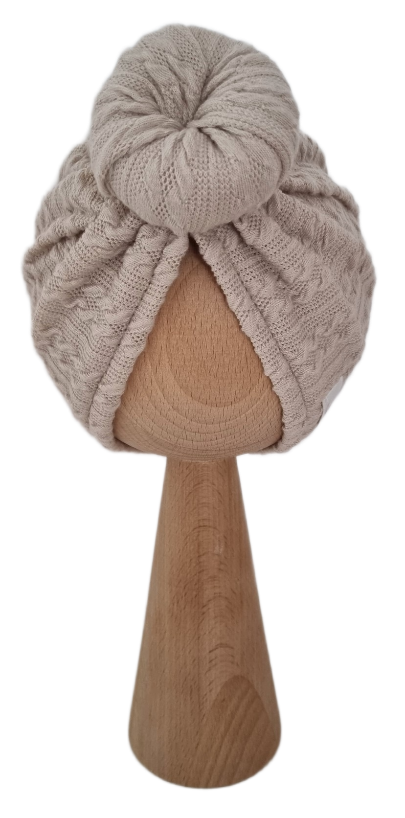 Turban wykonany jest z jednej warstwy materiału - wysokojakościowej dzianiny swetrowej, jakość PREMIUM, która jest bardzo miękka i delikatna.