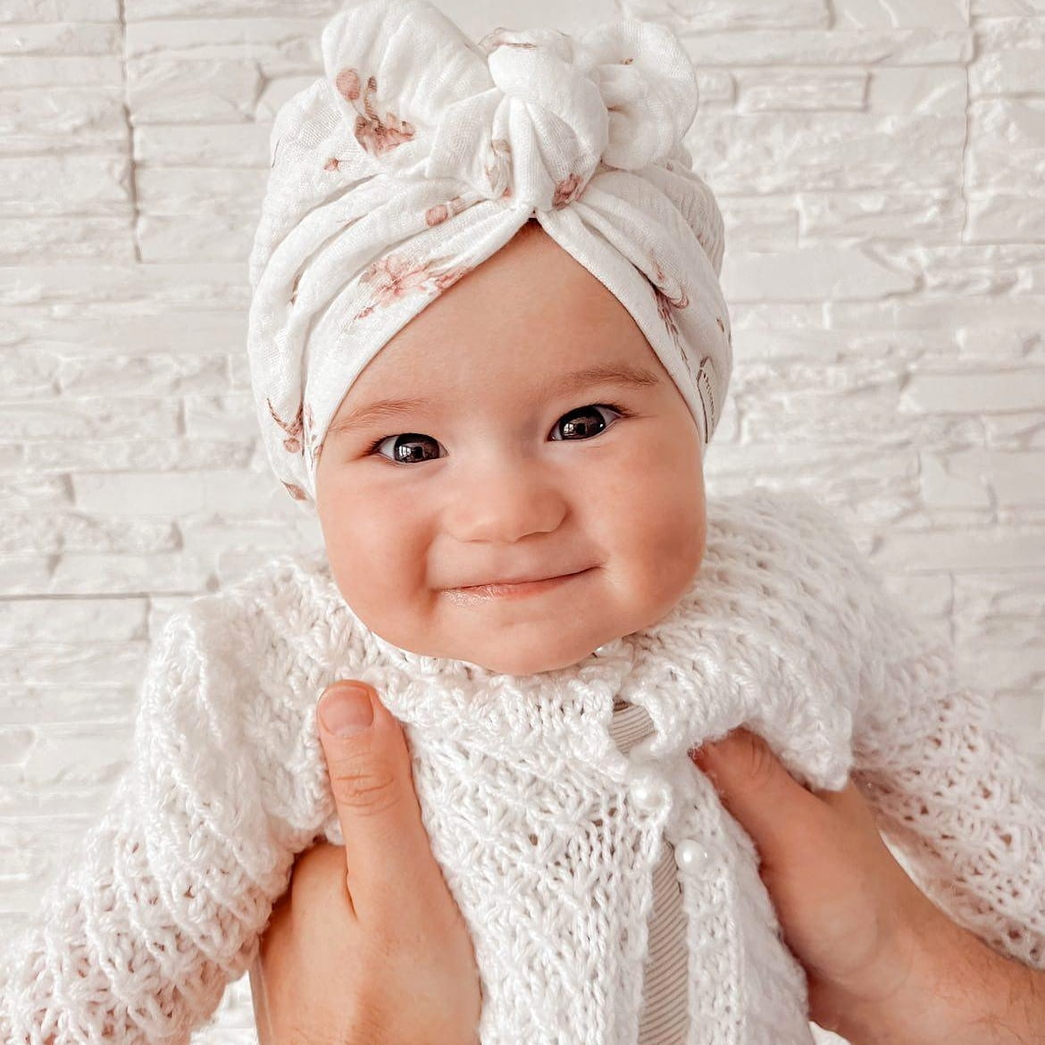 Muślinowe turbany to nasza propozycja na słoneczne i ciepłe dni. Turban jest bardzo praktyczny, ponieważ osłoni główkę dziecka przed słońcem i jednocześnie ochroni przed wiatrem.