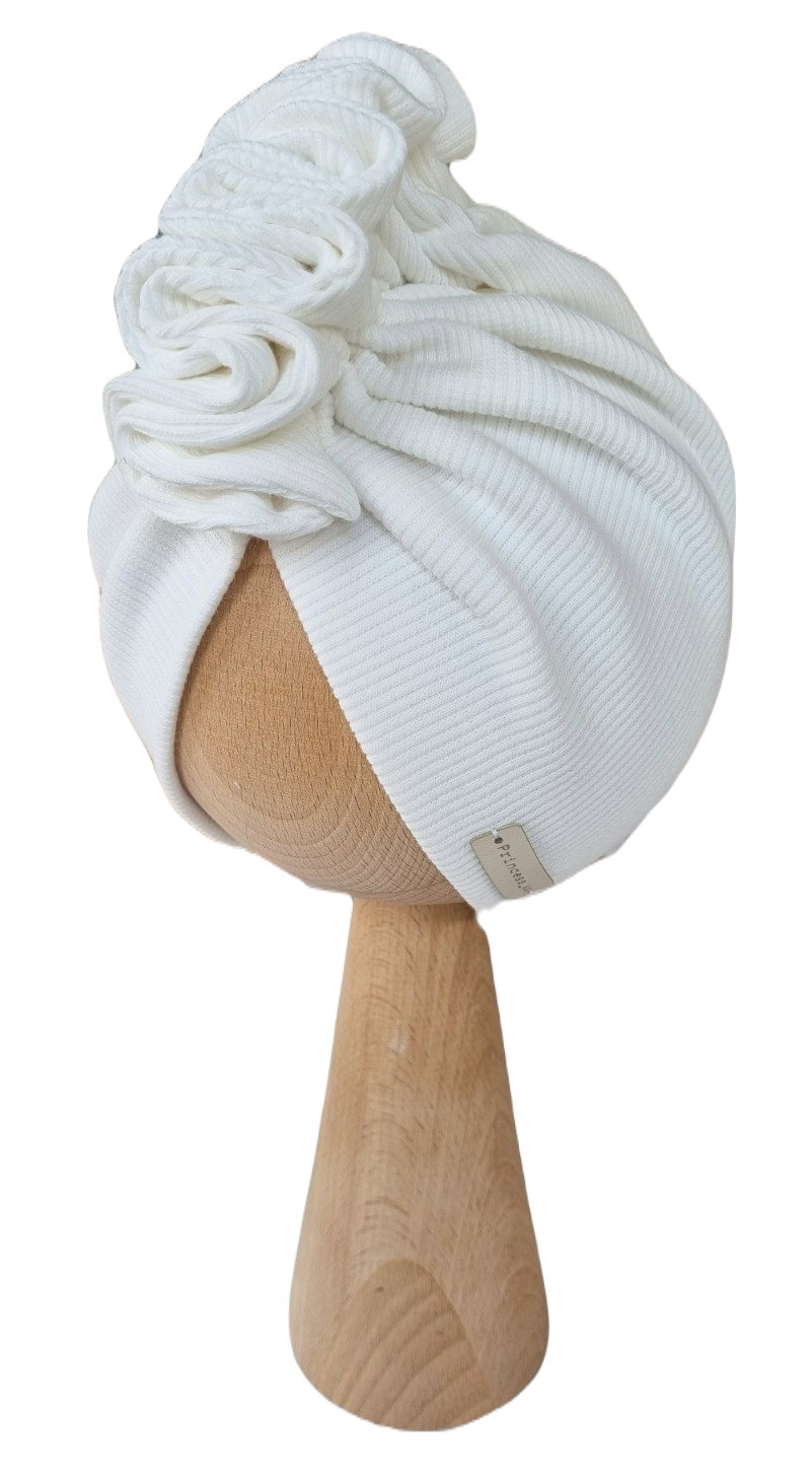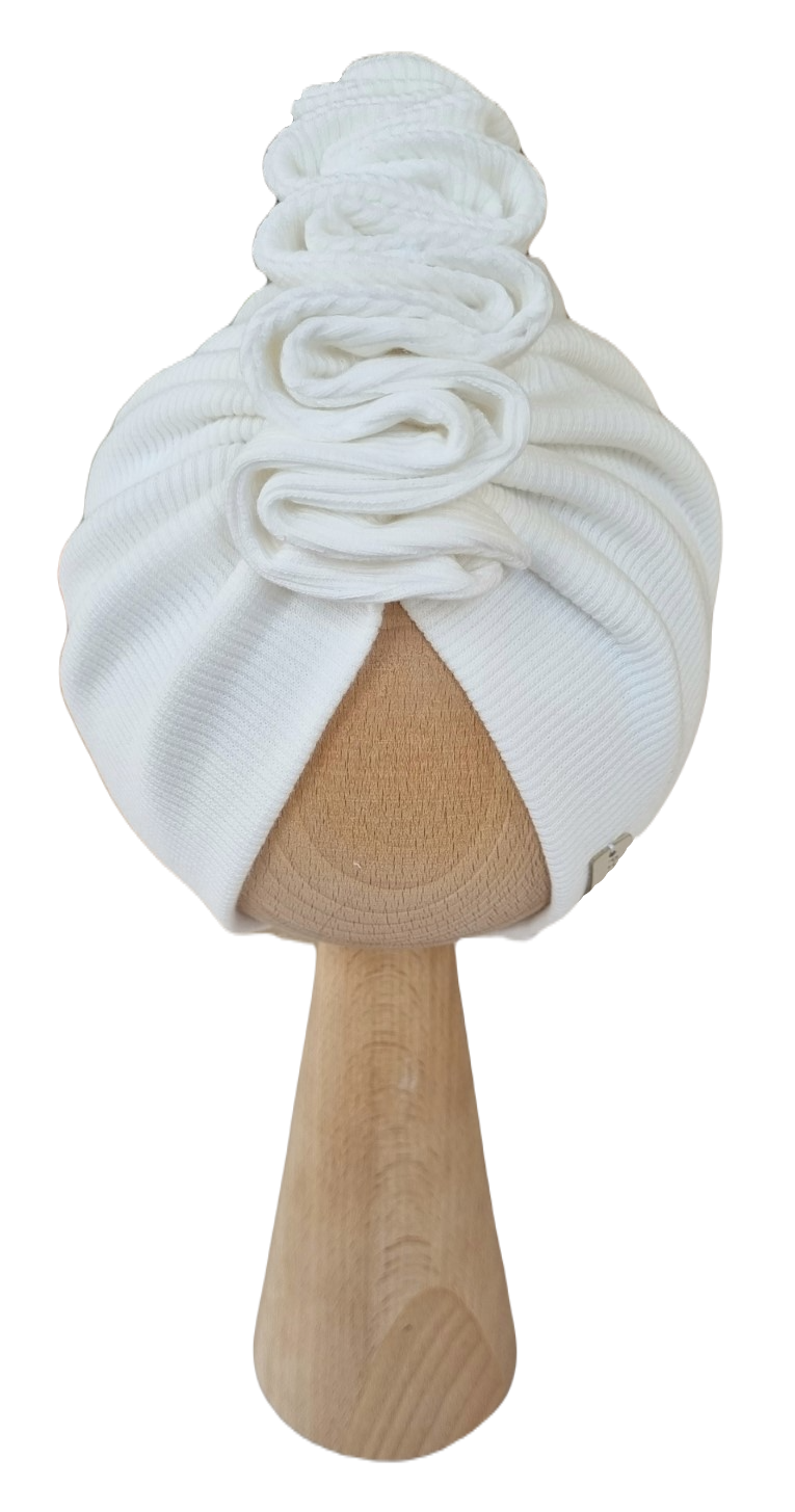 Piękny turban z ozdobnie zszytą falbanką wykonany z dzianiny prążkowanej.