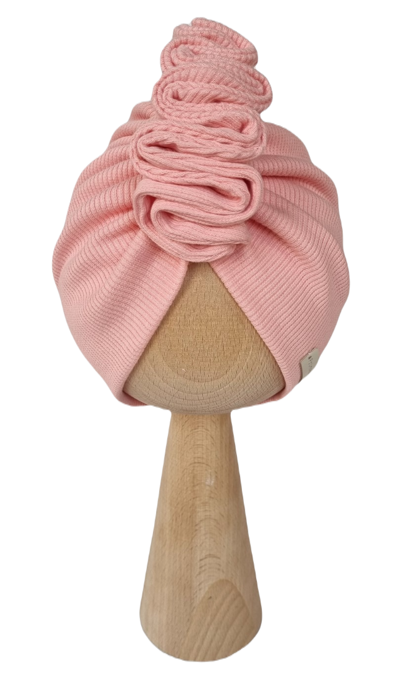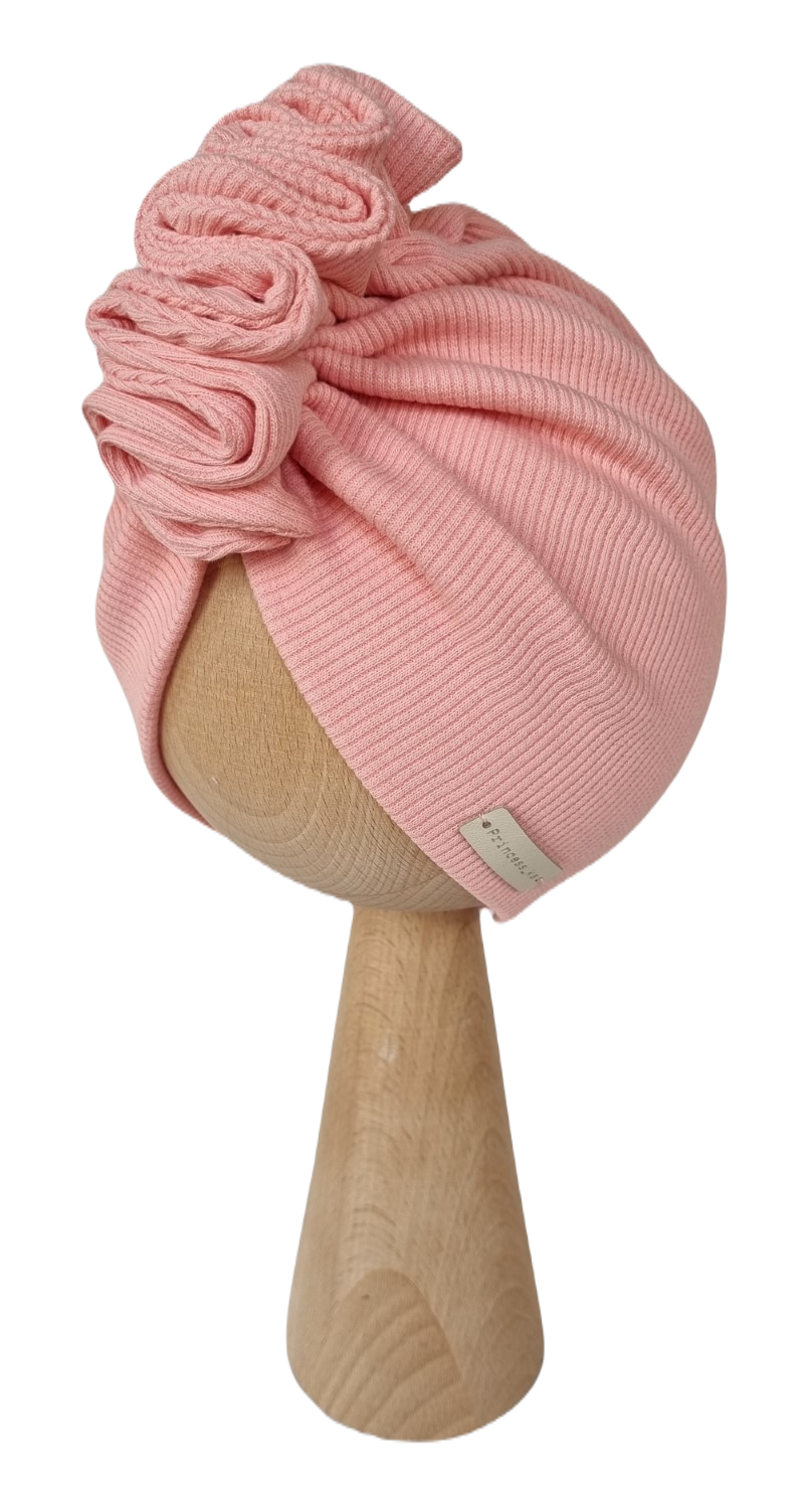 Piękny turban z ozdobnie zszytą falbanką wykonany z dzianiny prążkowanej.