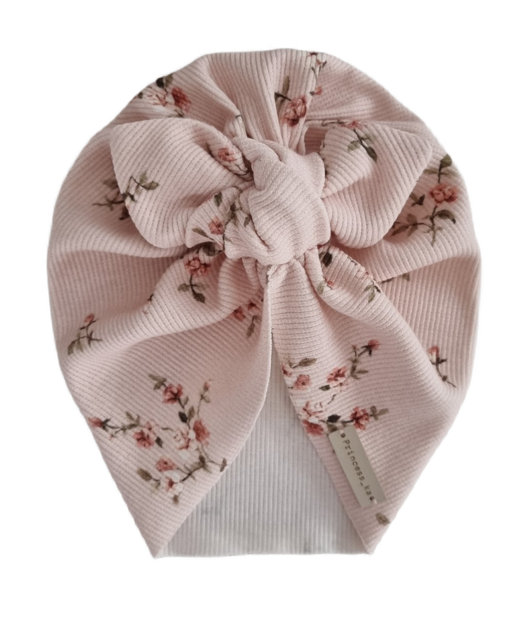 TURBAN MOTYLEK wykonany z bardzo elastycznej dzianiny prążkowanej, dzięki czemu idealnie dopasuje się do główki dziecka.