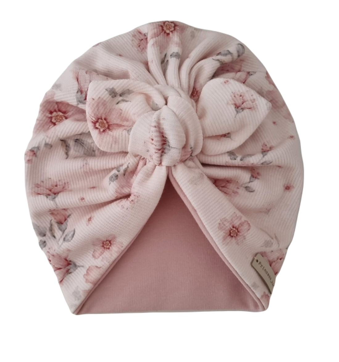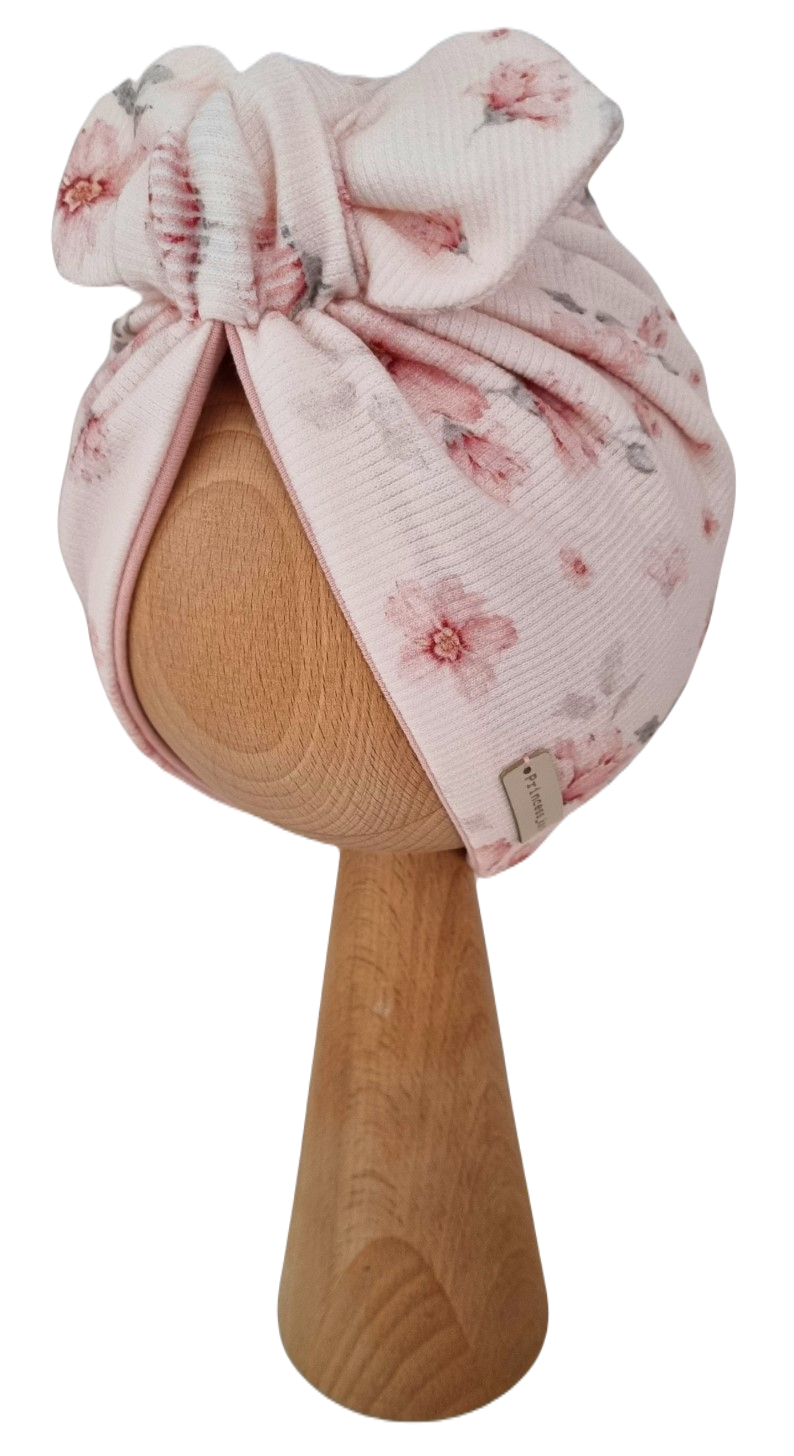 TURBAN MOTYLEK wykonany z bardzo elastycznej dzianiny prążkowanej, dzięki czemu idealnie dopasuje się do główki dziecka.