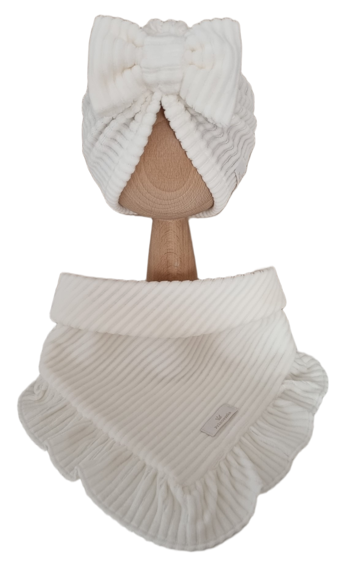 VELVET PRĄŻEK KOMPLET TURBAN KOKARDA I CHUSTA Z FALBANKĄ Ecru