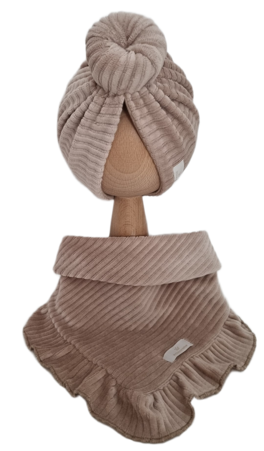 VELVET PRĄŻEK KOMPLET TURBAN PODWÓJNY DONUT I CHUSTA Z FALBANKĄ Ciemny Beż