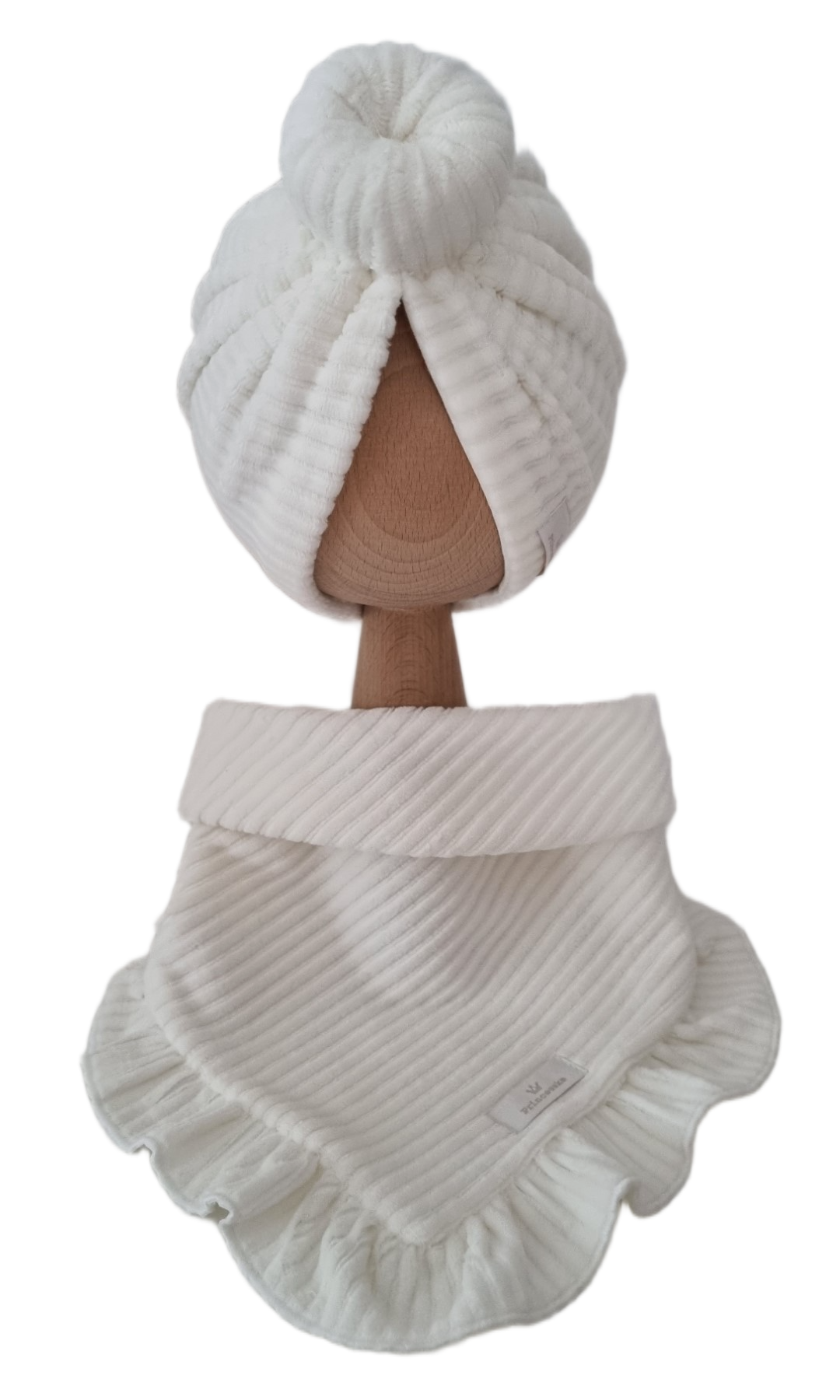VELVET PRĄŻEK KOMPLET TURBAN PODWÓJNY DONUT I CHUSTA Z FALBANKĄ Ecru